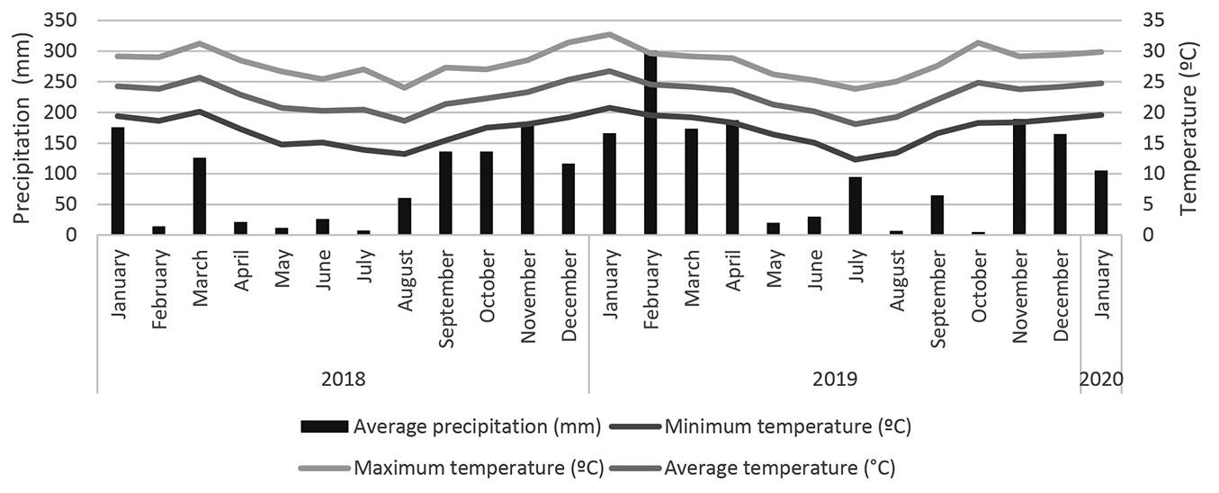 The values of precipitation, maximum, minimum, and average temperature recorded during the study period (January 2018 to January 2020), according to Ciiagro ([9]), are shown in Fig. 1.