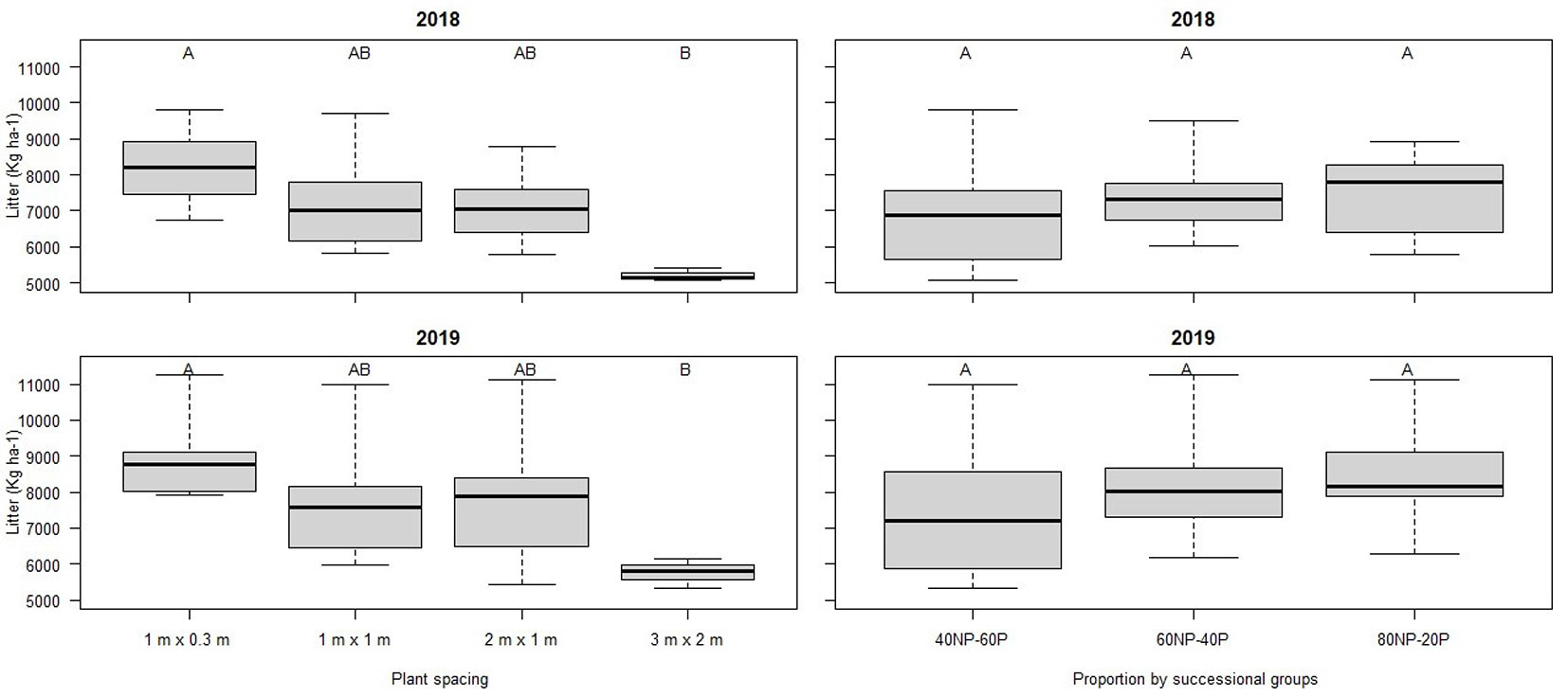 Fig. 2 - Box-plots of annual mean litterfall input results and Tukey’s test results (p <0.05) for spacing and successional group proportion over the years 2018 and 2019 in Itu, São Paulo, Brazil.
