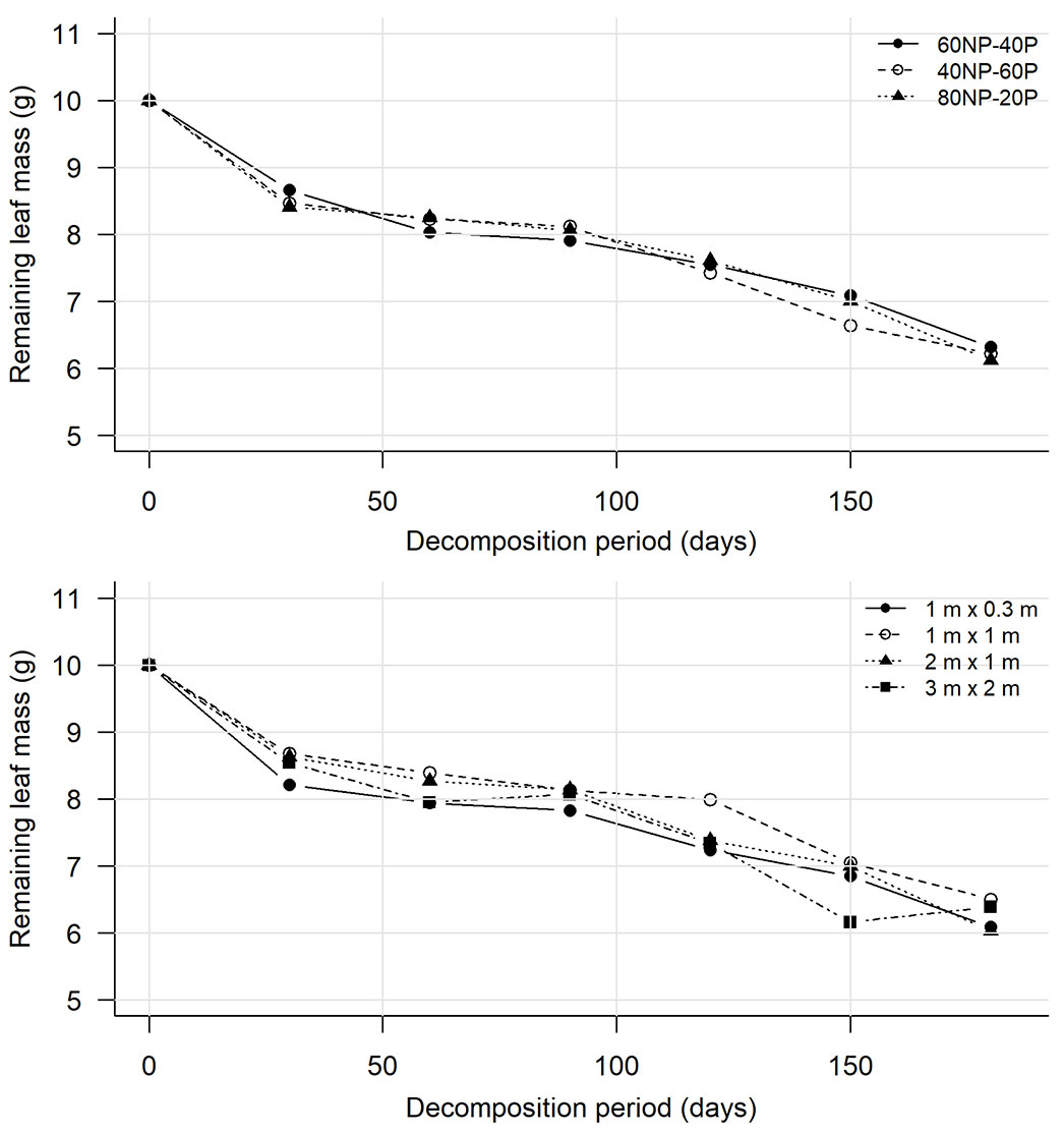 Early decomposition was studied using synthetic polymer litterbags measuring 20 × 20 cm with a 2 mm mesh ([33]). These litterbags were installed in July 2019, with three litterbags allocated per treatment (n = 10), per block (n = 3), per collection period (each lasting 6 months), totaling 540 units. Each litterbag was filled with a mixture of up to 10 grams of oven-dried (at 65 °C), intact, homogeneous leaves with no visible signs of decomposition, sampled from the species in each treatment. After 180 days, 90 individual litter bags were collected, dried at 60 °C until a constant mass was reached, and weighed. The change in dry mass from the initial mass at time zero (installation) was calculated, and the decomposition constant (k) was estimated following Scoriza et al. ([33] - eqn. 3):