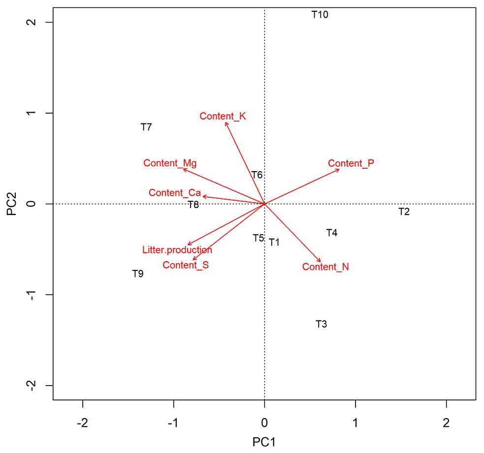 Principal component analysis (PCA) of treatments and variables explained 74% of the total data variation, with axis 1 (PC1) accounting for 48%, and axis 2 (PC2) accounting for 26% (Fig. 4). PC1 was associated with higher values of litter production, calcium, magnesium, and sulfur content. Litter production was directly related to S content and also influenced Ca and Mg contents when linked to T8 and T9, both dominated by non-pioneer species (60% and 80%) at the high-density spacing (1 × 0.3 m). Nitrogen and potassium contents were more closely associated with PC2 and the 1 × 1 m spacing, with nitrogen showing statistically significant differences (Tab. 4), and potassium content being lower for this spacing. Spacing arrangement had a greater impact on nutrient absorption, with treatment 3 × 2 m (T10) differing from the others, showing the lowest nutrient levels (see Appendix 2 in Supplementary material).