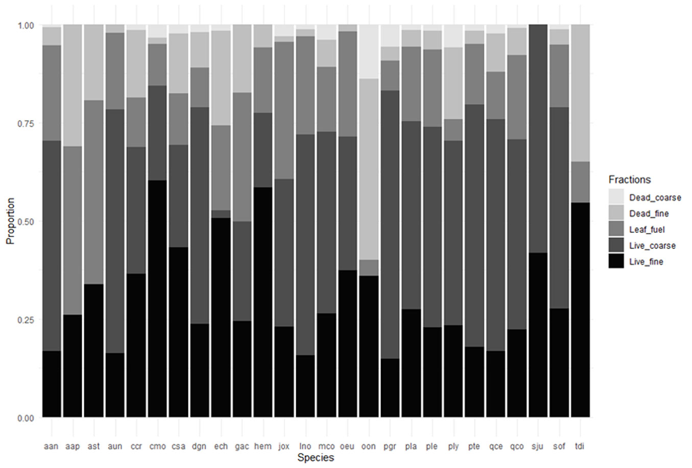 For each trait, we performed a one-way analysis of variance (ANOVA) to identify differences among species, followed by Tukey’s HSD test for multiple comparisons. Based on significant differences identified through post-hoc tests (P < 0.05), we assigned each species to one of the following flammability level groups for each trait: high, moderate-high, moderate, moderate-low, and low. Threshold values for each flammability level group for each trait were determined using this assignment procedure. However, in a few cases where sample sizes were too small to detect significant differences, exceptions to this rule were made during the grouping process. To visualize flammability levels, we used different colors to represent the groups in trait variability graphs. This approach allowed us to identify specific groups of relative flammability levels by considering the relationship of each trait with flammability (i.e., some traits had a positive relationship, while others had a negative one). Additionally, we used one-way ANOVA to analyze among-species differences in the proportion of fuel fractions of standing biomass for each trait. We used a percent stacked bar chart to display the proportion of fuel fractions for each species.