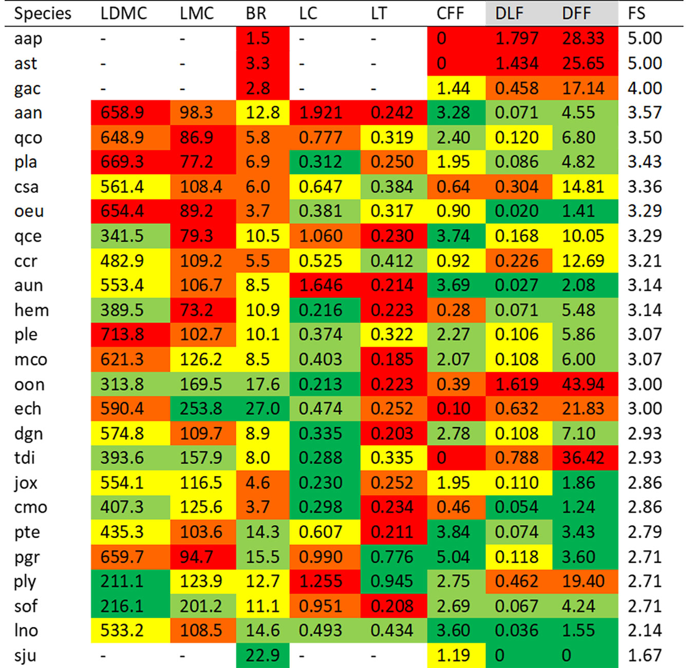 Fig. 2 - Mean values of nine flammability traits for each species and their overall flammability scores (FS). The flammability level of each species and trait is represented by different colors: red (high), orange (moderate-high), yellow (moderate), light green (moderate-low), and dark green (low). Species are sorted by their overall flammability scores. Detailed graphs for each trait are provided in Figs. S2-S9. Trait names are listed in Tab. 2, species codes are provided in Tab. 1, and trait units are given in Tab. 3.