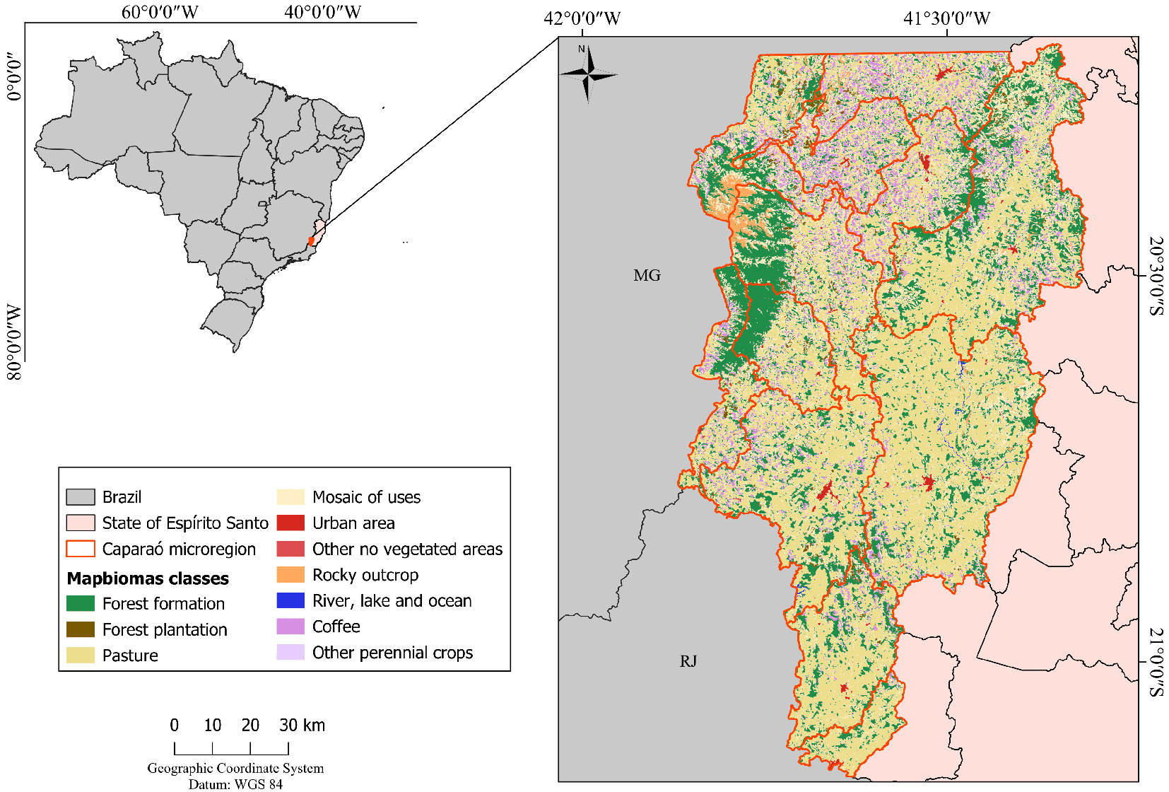 The state of Espírito Santo (ES), located in southeastern Brazil, spans an area of 46,074,448 km2 and has a population of 4,108,508 inhabitants ([20]). The Espírito Santo State is divided into ten microregions ([16]); in this study, we focus on the Caparaó microregion, located in the southern portion of Espírito Santo. This area is characterized by mountainous terrain and includes the Caparaó Mountain Range, a critical zone for preserving the Atlantic Forest in Espírito Santo ([21]).