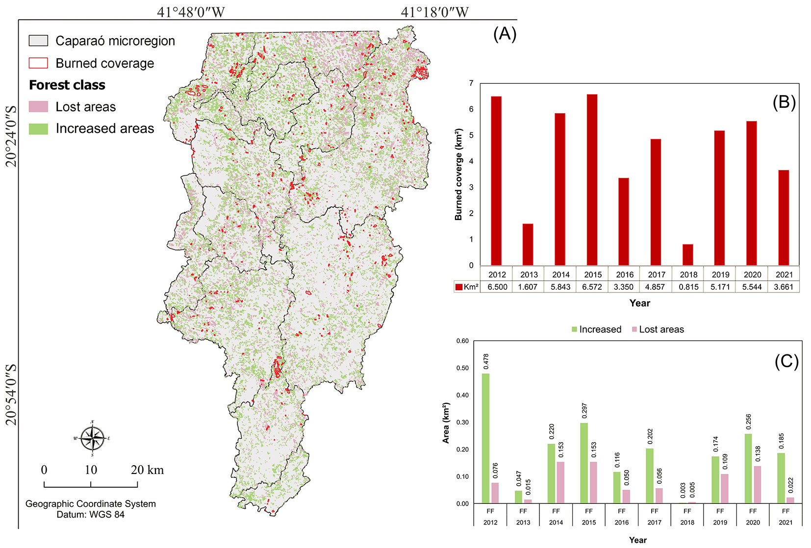 Fig. 2 - (A) Spatial distribution of burned areas and areas of forest formation (FF) increment and loss between 2012 and 2021 across the entire Caparaó microregion, state of Espírito Santo, Brazil; (B) temporal evolution of burned areas (km2); and (C) changes in forest formation (FF) occurring only within the boundaries of burned areas. Note: (B) and (C) refer exclusively to the area affected by fire, as outlined in Fig. 2A.