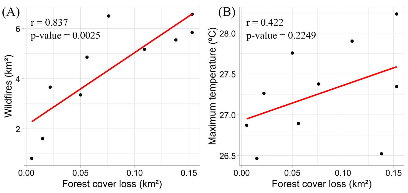 Fig. 3 - Correlation between forest loss (km2) and (A) forest fires (km2) and (B) maximum temperature (°C) in the Caparaó microregion, state of Espírito Santo, Brazil.