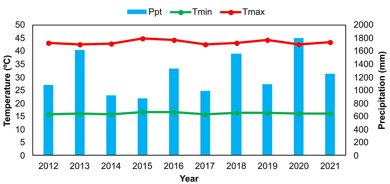 Meteorological data were obtained from the Brazilian Daily Weather Gridded Data collection ([48]) via Google Earth Engine™, and processed in QGIS v. 3.28.4. Average values were extracted for precipitation, maximum and minimum temperatures, solar radiation, and relative humidity in the study area. Values for 2021 were estimated by averaging data from 2012 to 2020 to compensate for limitations in the data series.
