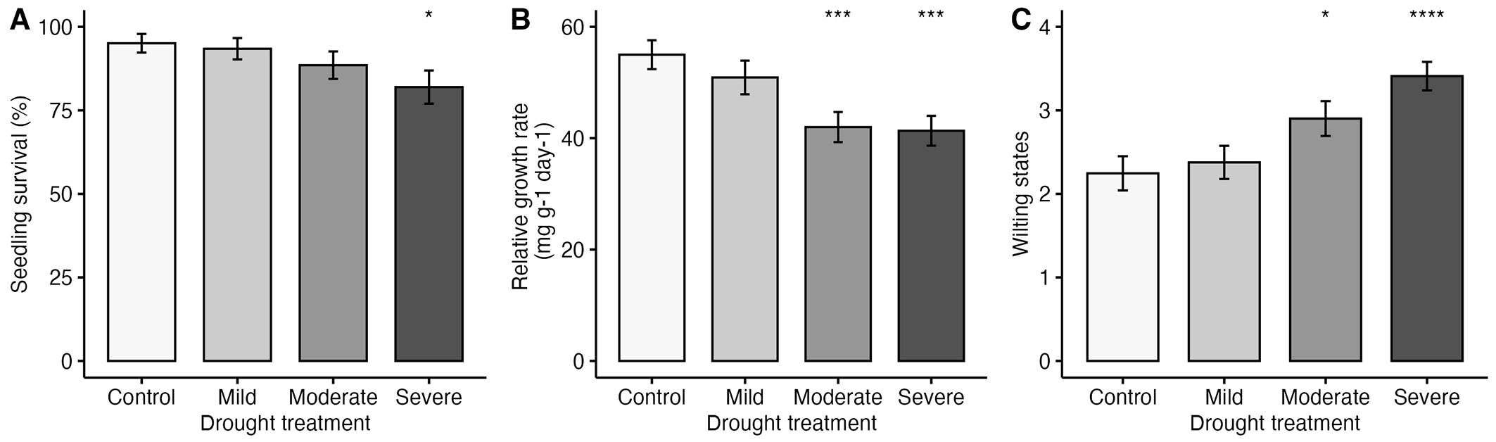 Fig. 1 - Drought treatment effects on seedling performance (A) seedling survival, (B) relative growth rate, and (C) wilting states. P-value is based on comparison with control using the Kruskal-Wallis test followed by the Wilcoxon post-hoc rank sum test. (*): p < 0.05; (***): p < 0.001; (****): p < 0.0001.