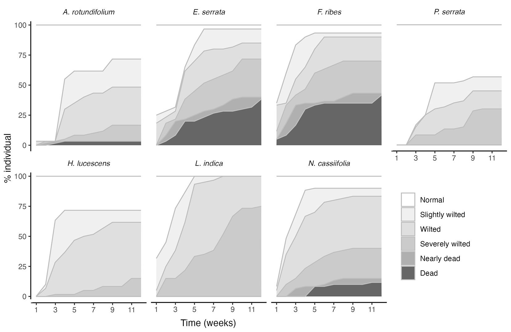 Wilting was significantly more pronounced under moderate and severe drought than under control conditions (Fig. 1, Fig. S4). In most species, drought treatments caused wilting, with varying effects among species (Fig. 2). E. serrata, F. ribes, and L. indica wilted early, with some individuals dying early except for L. indica. Conversely, A. rotundifolium, H. lucescens, and P. serrata showed minimal visible drought stress and low mortality. There was a continuum of responses, with species such as E. serrata, F. ribes, and N. cassiifolia exhibiting varying degrees of wilting and mortality.