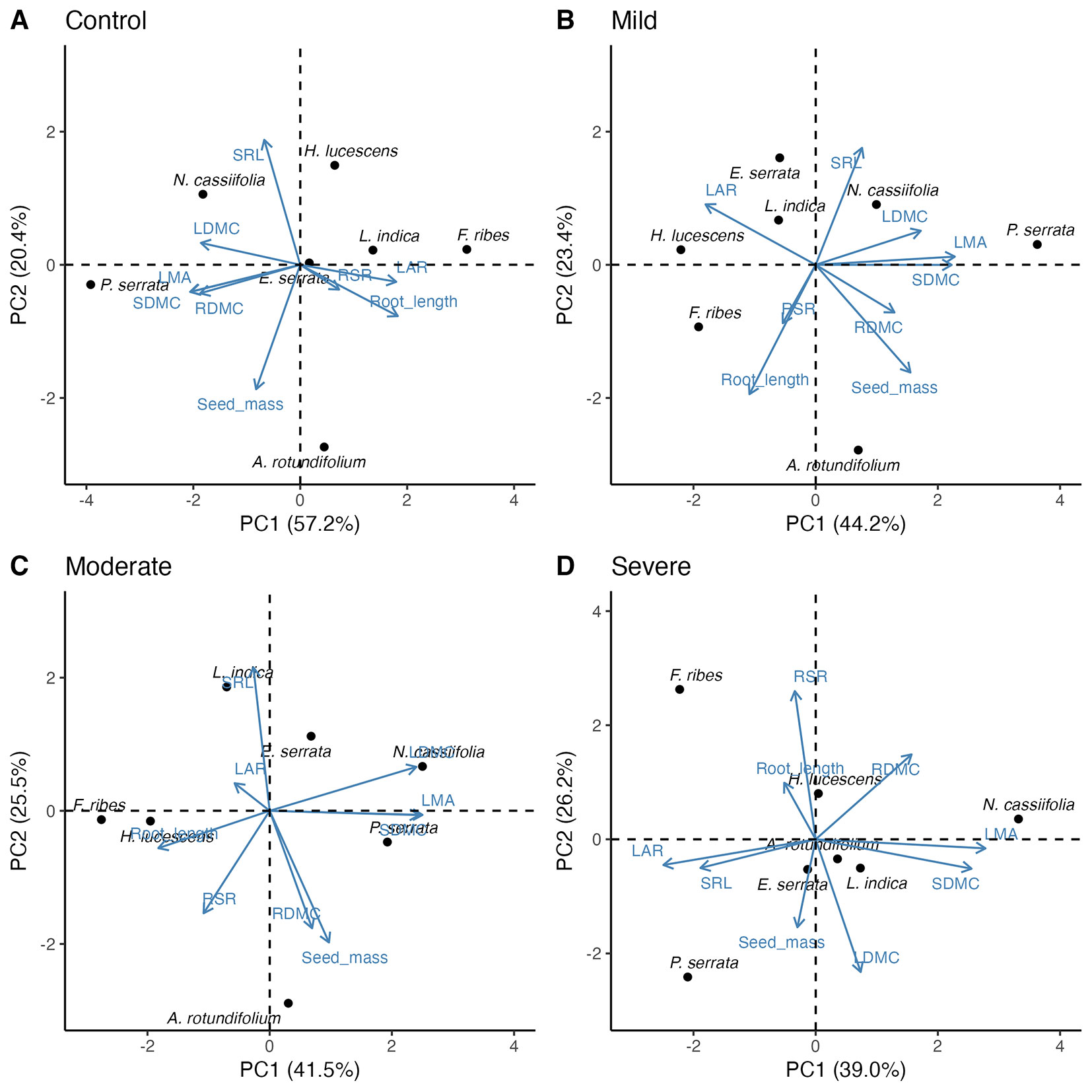 Fig. 3 - Biplot of principal component analysis for the first and second axes of 9 traits for control (A), mild (B), moderate (C), and severe drought treatments (D). Points are species in trait space. See Tab. 2 for trait abbreviations.