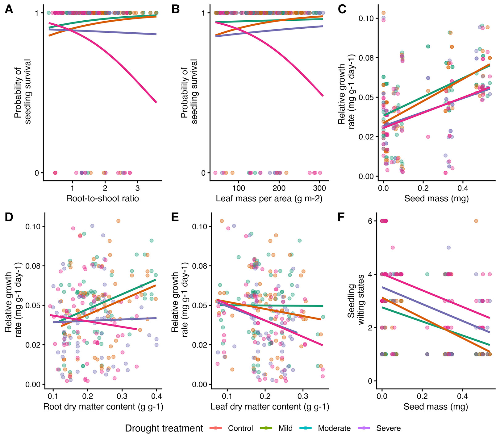 Fig. 4 - The relationships between the probability of seedling survival (A-B), relative growth rate (C-E), wilting states (F), and the significant functional traits (root-to-shoot ratio, leaf mass per area, seed mass, root dry matter content, leaf dry matter content) across four treatment conditions (control, mild, moderate, severe). The colors represent drought treatments, the lines depict model predictions, and the scatter points represent individual data points for each treatment. All models were corrected for heteroscedasticity.