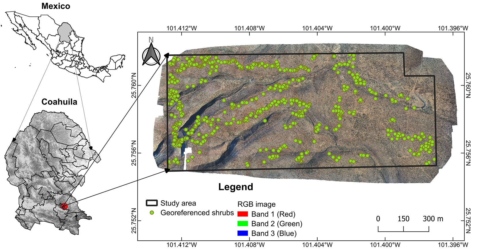 The study area is located within the Ejido Hipólito, Ramos Arizpe Municipality, Coahuila, Mexico (25.756° N, 101.408° W; WGS84 - Fig. 1), covering 116 ha, with altitudes ranging from 1134 to 1249 m a.s.l. and an average slope of 16%. The climate is arid/semi-warm (BSohw), with a precipitation range of 125-300 mm per year and average temperatures of 9-28 °C. The vegetation corresponds to rosetophilous desert scrub under current forest management, dominated by shrubs such as Agave lechuguilla Torr. (Lechuguilla), Euphorbia antisyphilitica Zucc. (Candelilla), Jatropha dioica Cerv. (Sangre de Drago), Larrea tridentata (Sessé & Moc. ex DC.) (Gobernadora), Hechtia glomerata Zucc. (Guapilla), Opuntia spp. (Nopal), and trees such as Vachellia farnesiana (L.) Willd. (Huizache) and Neltuma glandulosa Torr. (Mezquite).