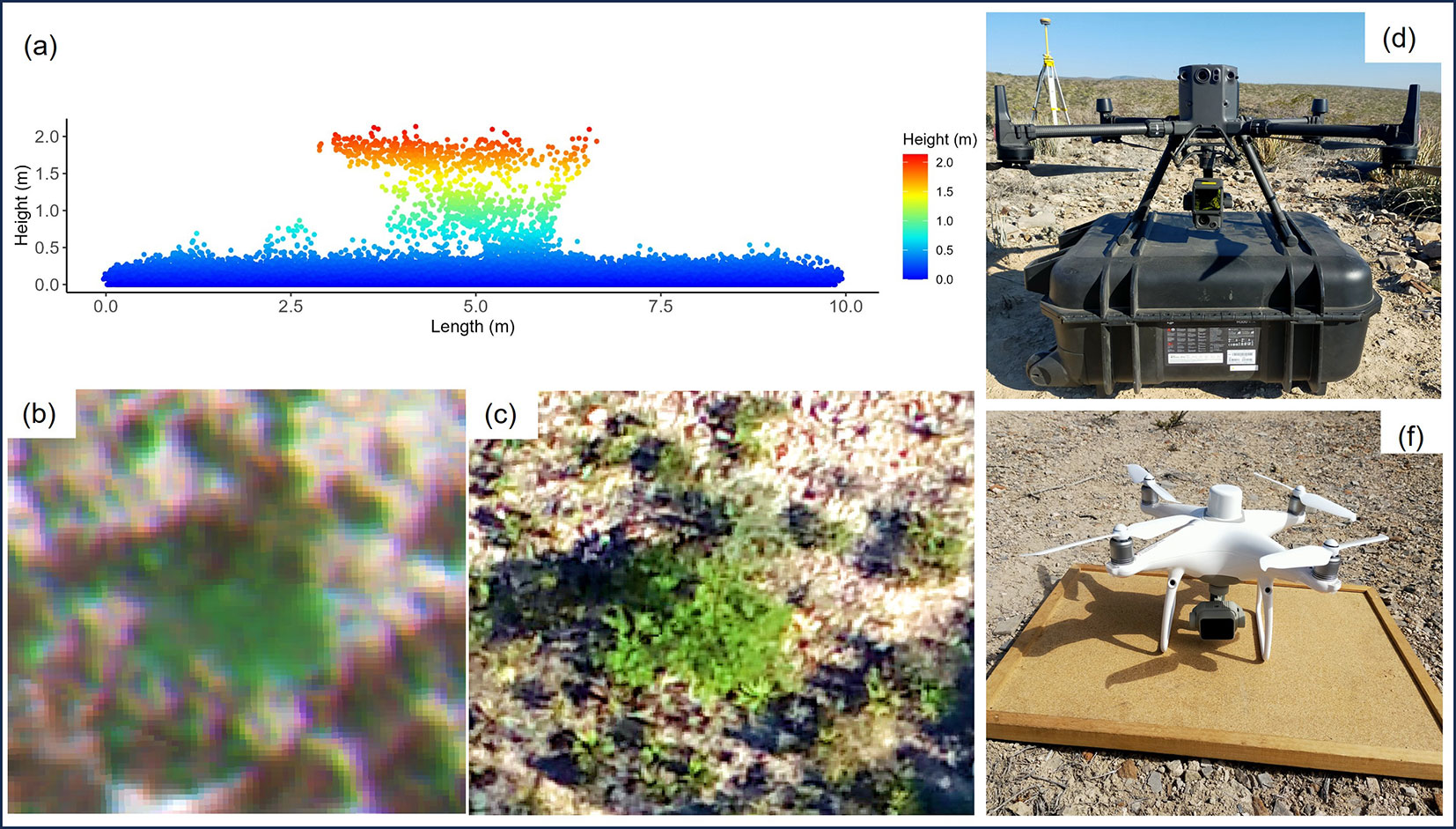 Fig. 2 - Remotely sensed view of shrub species. LiDAR point cloud (a), multispectral image (b), and RGB image (c). Data acquisition equipment: DJI Matrice 300 RTK with Zenmuse L1 (d) and DJI Phantom 4M (f).