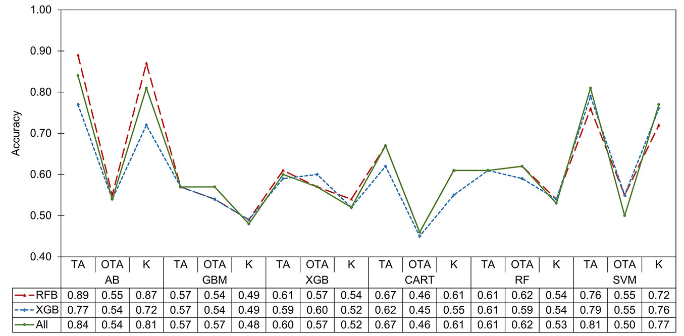 As for OTA, the best models were RF (0.61), XGB (0.58), and GBM (0.55), whereas the rest showed a drop in OTA relative to TA, suggesting overfitting and the inability to predict new observations accurately. In this parameter, CART (0.46) had the lowest fit (Fig. 3). The algorithms that performed best in bush classification were AB, SVM, and RF. The first two were chosen for their ability to fit the training data, while the last one stood out for its statistical stability and higher prediction accuracy (OTA). Using these three best-fitting algorithms and the set of metrics generated with RFB, which was superior, the remote sensing data types were evaluated for species and shrub class classification.