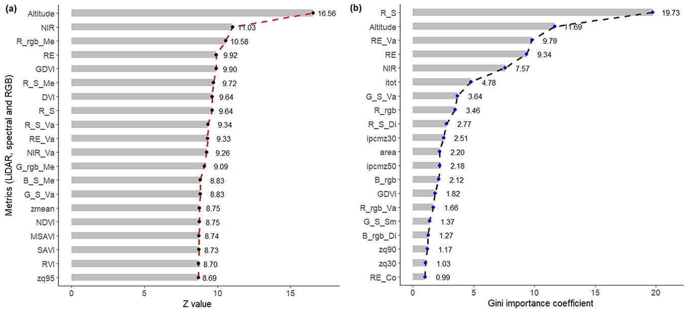 Spectral data made a greater contribution to species and shrub group classification, as they provided more variables. Among the 20 variables with the highest importance, spectral data contributed with 10 metrics to the shrub classification (NIR, DVI, RS, RE, GDVI, SAVI, NIR_Va, MSAVI, GS, BS), compared to eight metrics extracted from LiDAR (Altitude, zmean, zq95, zq85, zmax, zq65, zsd, zq80) and two metrics from the RGB image (Rrgb_Me, Grgb_Me - Fig. S3 in Supplementary material). Of all metrics, altitude made the most significant contribution, followed by a group of spectral variables (bands and VI NIR, DVI, RS, RE, GDVI). Texture metrics from RGB data had less influence on species discrimination.
