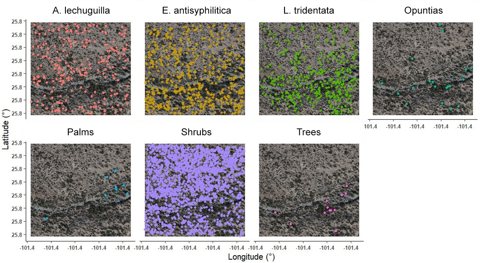 For the analysis, individual coordinates were organized by species, focusing on the highest-density species: A. lechuguilla (101 specimens), E. antisyphilitica (150), and L. tridentata (92). Additionally, morphologically similar species were grouped into shrub categories, such as opuntias (50 specimens), which included Opuntia rastrera Weber, O. engelmannii subsp. Lindheimeri, Cylindropuntia leptocaulis (DC.) F. M. Knuth, C. imbricata (Haw.) F.M.Knuth; palms (36 specimens), including Yucca filifera Chabaud, Y. treculeana Carrière, Dasylirion cedrosanum Trel.; trees (44 specimens), including V. farnesiana, Senegalia berlandieri Britton & Rose, V. rigidula Benth., N. glandulosa; and shrubs (173 specimens), comprising all remaining species not classified into previous groups.