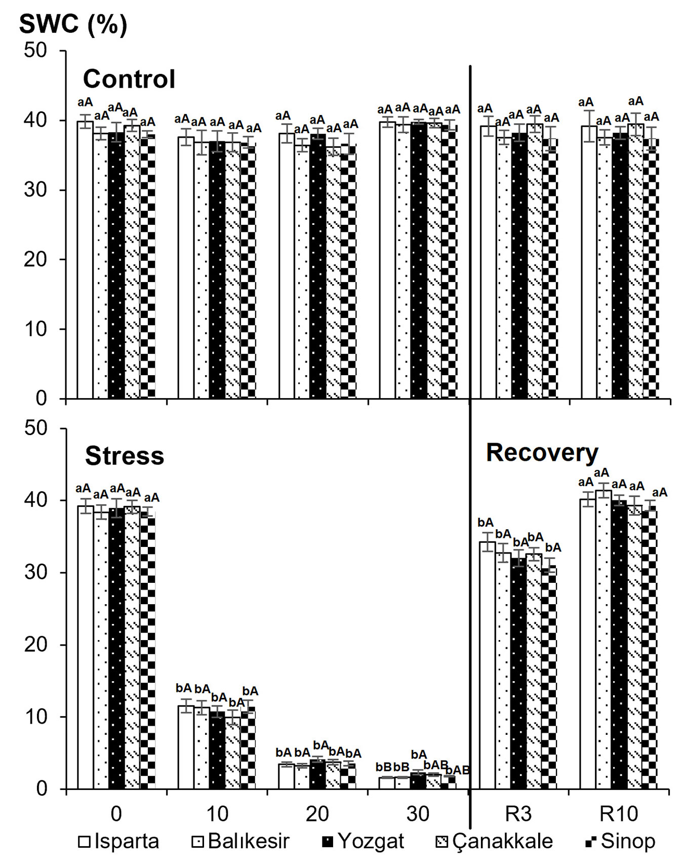 Chlorophyll content decreased significantly in all populations on the 30th day of drought stress (Fig. 6). After rewatering, chlorophyll content was similar to that of the control treatments in Isparta and Çanakkale populations on the 3rd day and in other populations on the 10th day.