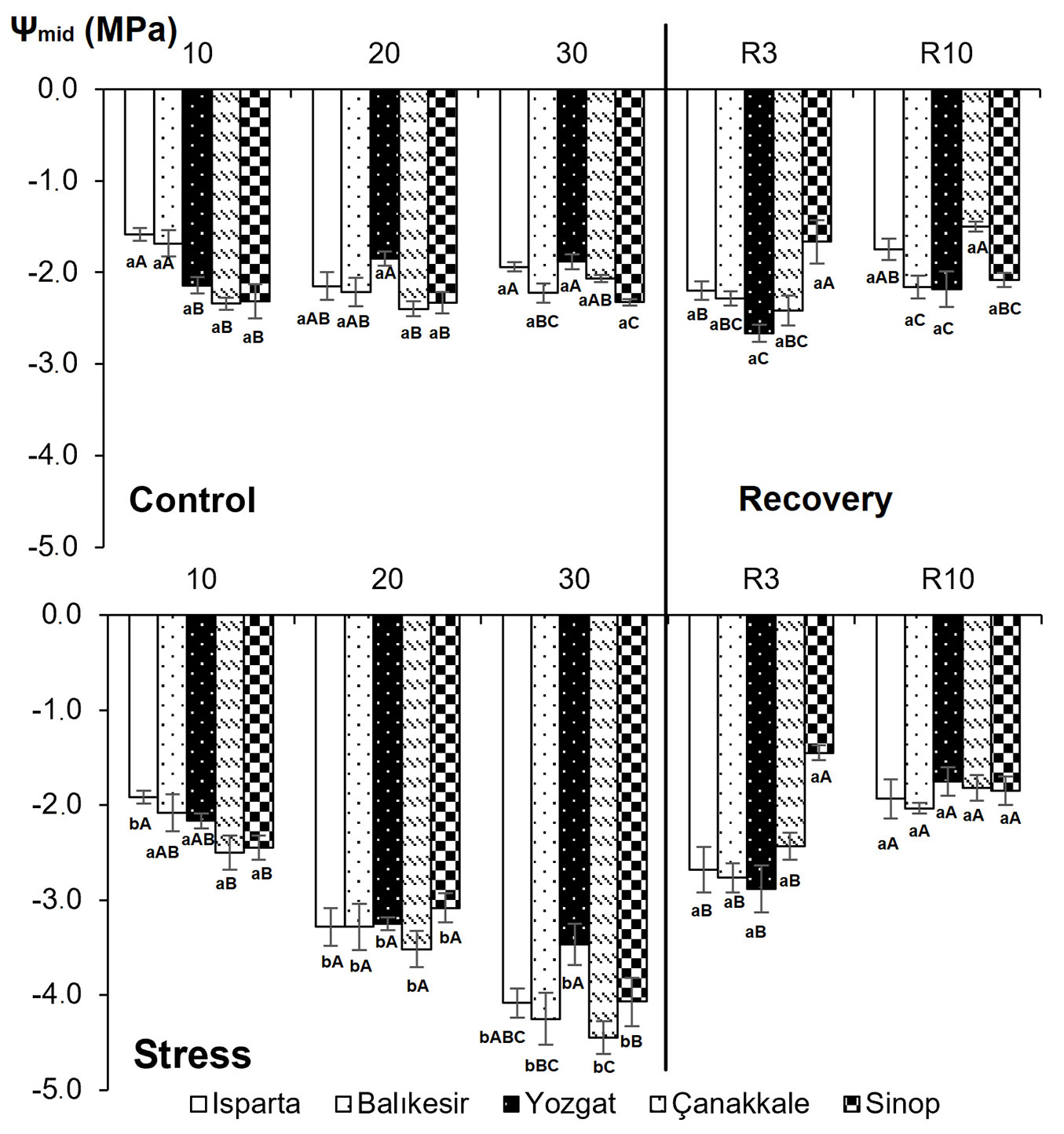 Regarding midday water potential, interactions across populations, treatments, and sampling times were highly significant (P < 0.01 - Tab. 2). Midday water potential decreased gradually with increasing drought stress. In the semi-arid Yozgat population, the highest midday water potential (-3.5 MPa) was found on the 30th day of drought stress. The lowest midday water potential (-4.5 MPa) was recorded in the Çanakkale population, originating from a humid climate. Midday water potential of previously stressed plants reached levels comparable to those of control plants by the end of the drought-recovery phase (R3 - Fig. 2). On the third day of recovery following drought stress, midday water potential was similar across all treatments.