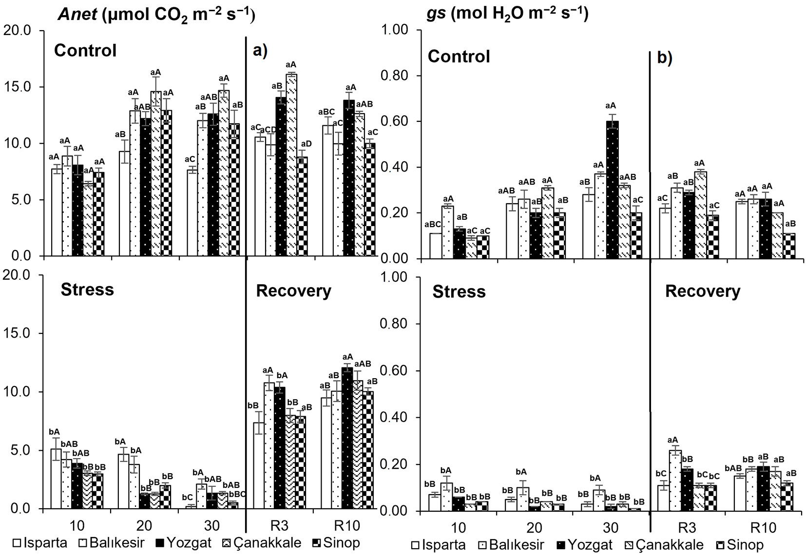 Fig. 3 - Photosynthetic characteristics (a: net photosynthetic rate, Anet; b: stomatal conductance, gs) of Q. cerris seedlings grown under the different drought treatments. Data are presented as means ± standard error (SE). Differences between treatments are shown with lower-case letters, while differences between populations are indicated with upper-case letters.