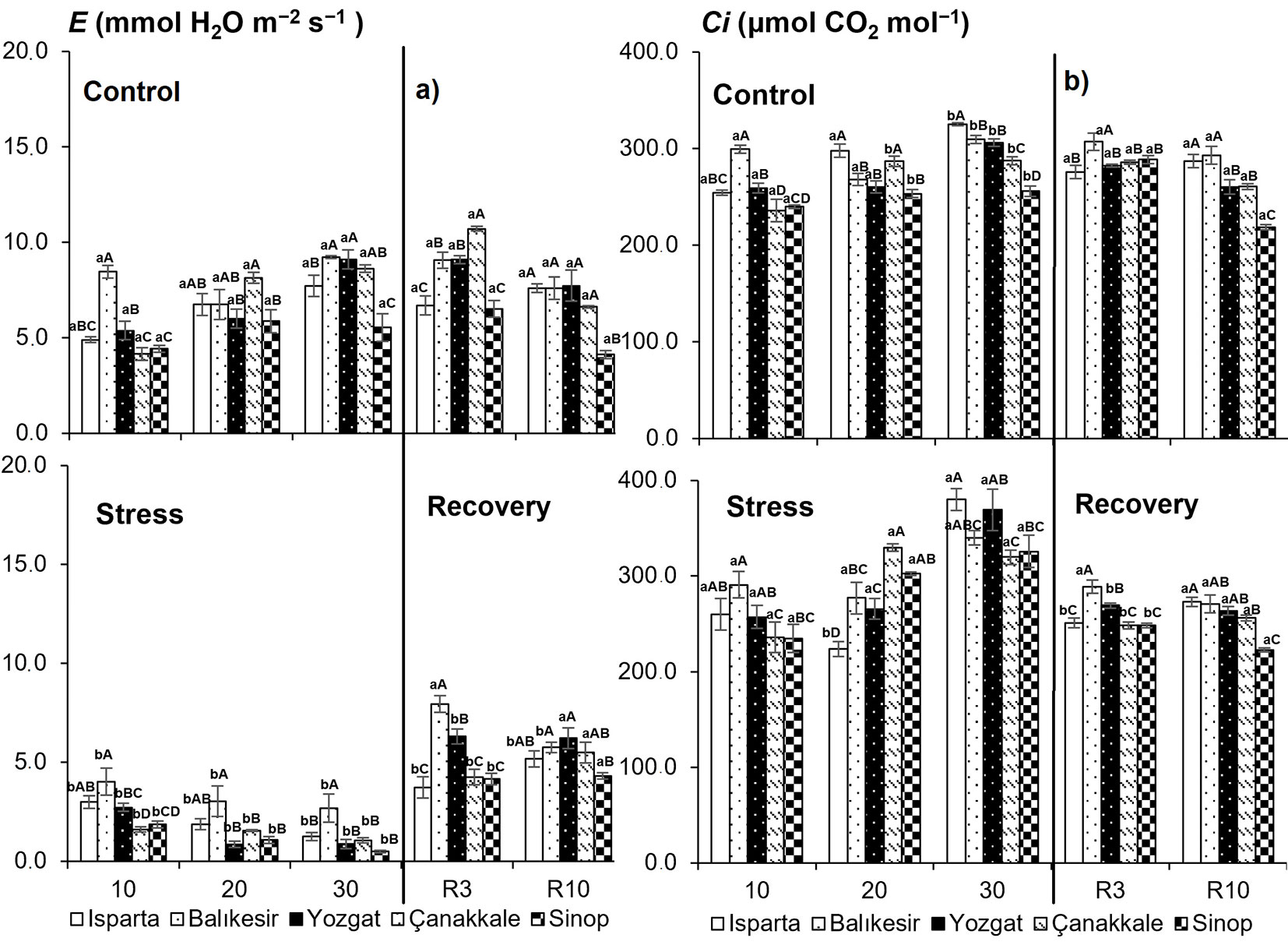Fig. 4 - Impact of drought stress on (a) transpiration rate (E) and (b) intercellular CO2 concentration (Ci) under different drought treatments. Data are presented as means ± standard error (SE). Differences between treatments are shown with lower-case letters, while differences between populations are indicated with upper-case letters.