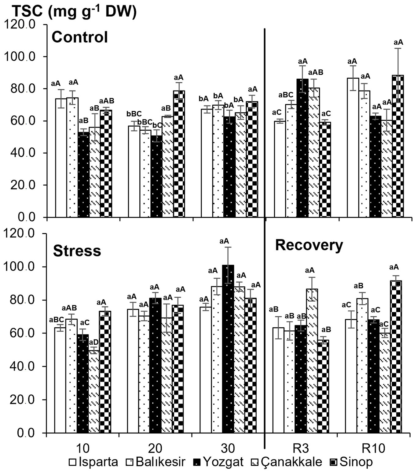 Fig. 5 - Total soluble sugar (TSC) content in five Quercus cerris populations under control and drought stress conditions. Data are presented as means ± standard error (SE). Differences between treatments are shown with lower-case letters, while differences between populations are indicated with upper-case letters.