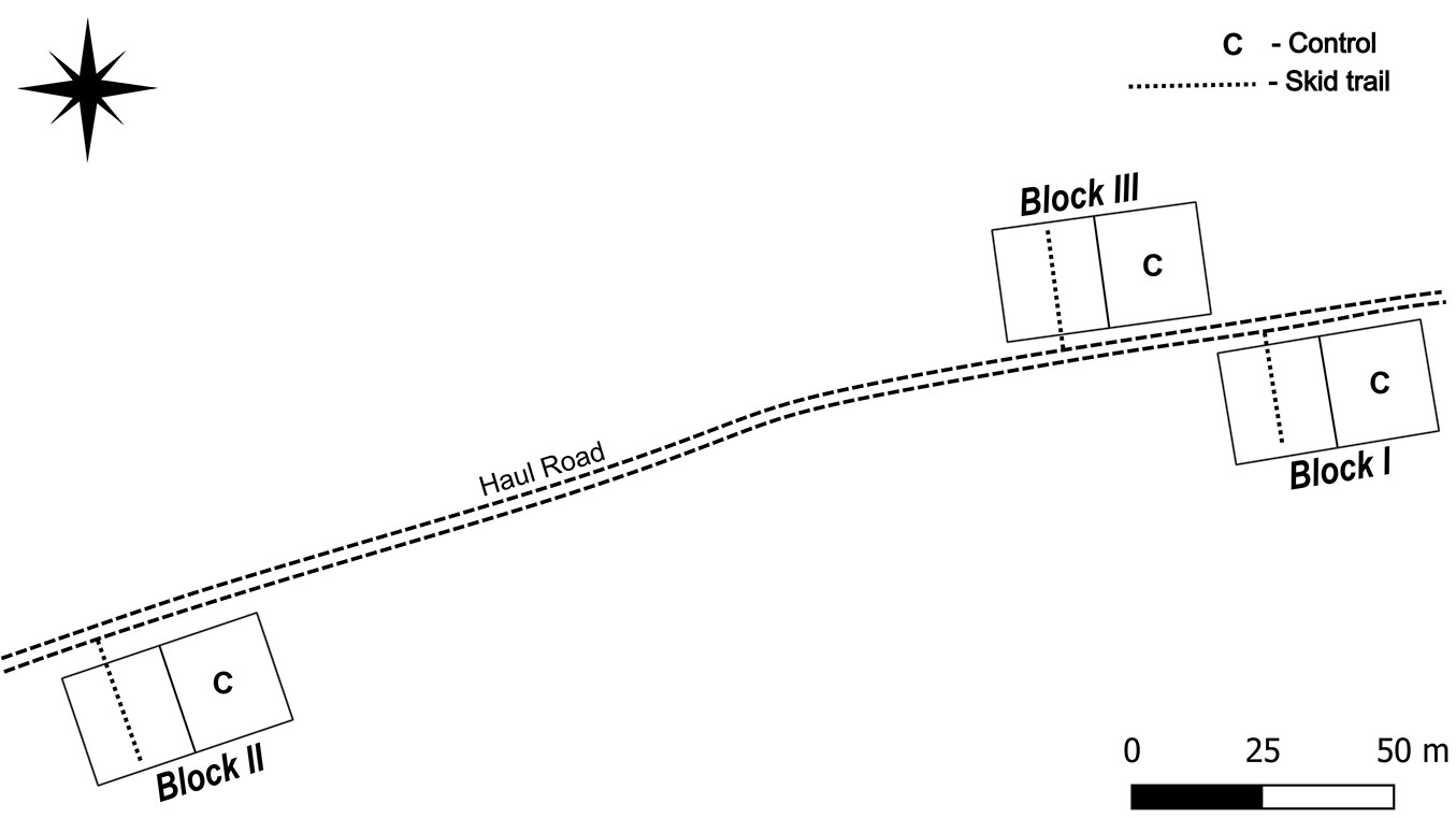 The experiment was established in 2021 to compare the impacts of increased logging traffic and seasonal differences in soil moisture on soil compaction. The initial study included three blocks, each with six treatments and a control. Treatments included skid trails with traffic intensities of 1, 3, and 12 machine cycles in both the wet and dry seasons. A machine cycle consisted of one ingress followed by the skid trail’s subsequent egress. These differing machine cycles were meant to represent the various skid trail traffic intensities of logging operations: 1 - tertiary skid trails, 3 - secondary trails, and 12 - primary skid trails. In 2023, small-scale logging in the area reused most of the skid trails for log skidding. However, the dry season treatment consisting of 12 machine cycles, as well as the undisturbed controls, were not used in the small-scale logging. These unaffected trails and controls were preserved for the present study (Fig. 3). In each of the three blocks, two sub-blocks were designated: a control replicate and a skid trail replicate. The dry-season skid trails with 12 machine cycles were previously compacted to a mean bulk density of 1.05 g cm-3, representing a 28% increase over the undisturbed old-growth forest controls at 0.82 g cm-3 ([14]).