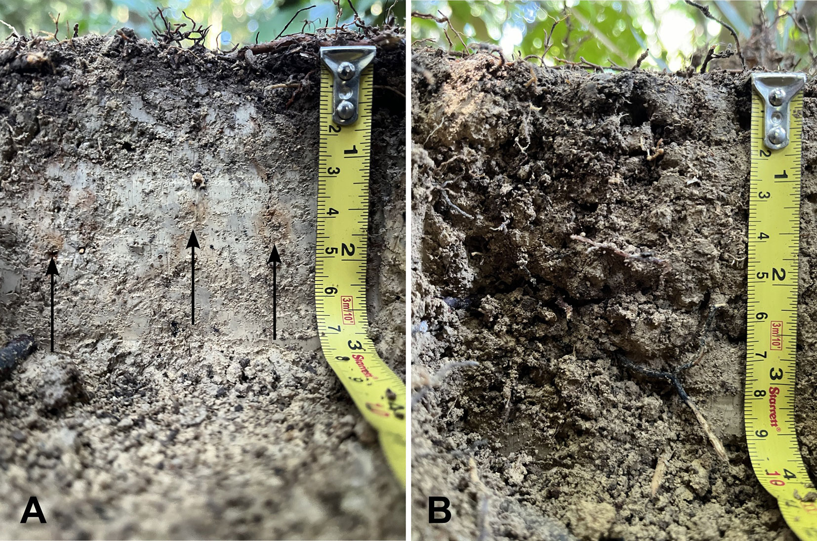 Fig. 4 - Soil profile of (A) skid trail soil with orange mottles and (B) undisturbed forest soil with extensive macroporosity.