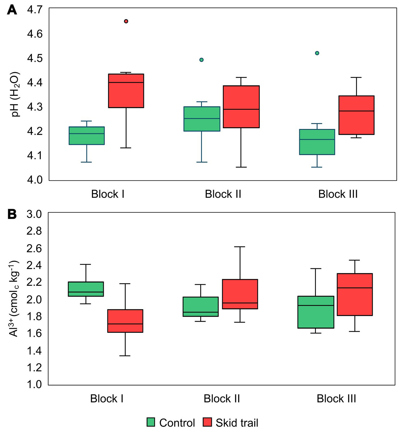 When stratified into skid trails or controls, there were no correlations between fine root biomass (FRB) and soil chemical properties. However, when combined, there was a moderate negative correlation between pH and FRB (rs = - 0.408, p = 0.001). Overall, soil chemical properties were similar across skid trails and controls (Tab. 1), although orange soil mottles were observed exclusively in the skid trails (Fig. 4). However, the range of pH values was slightly higher in the trails (4.05 - 4.65), compared to the controls (3.92 - 4.52 - Fig. 5A). Exchangeable aluminum had a greater range in the skid trails, 1.33 - 2.61 cmolc kg-1, as opposed to 1.60 - 2.40 cmolc kg-1 in the controls (Fig. 5B). These two chemical properties, pH and Al3+, where very strongly and negatively correlated in the skid trails (rs = -0.809, p < 0.001), whereas in the controls the relationship between the two properties was weak (rs = -0.265, p = 0.156). However, there was no observable influence from soil chemical properties evaluated on FRB within the skid trails.