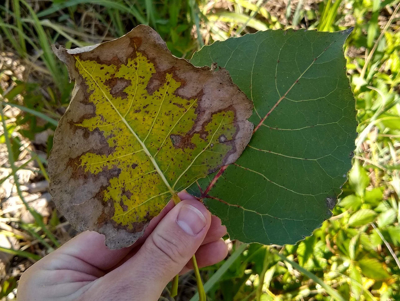Fig. 1 - Salt-damaged and undamaged leaves of P. deltoides in a mixed clonal stand. The leaf with burned margins is from P. deltoides clone ’Hovyú INTA’, while the undamaged one corresponds to P. deltoides clone ’Australiano 129/60’.