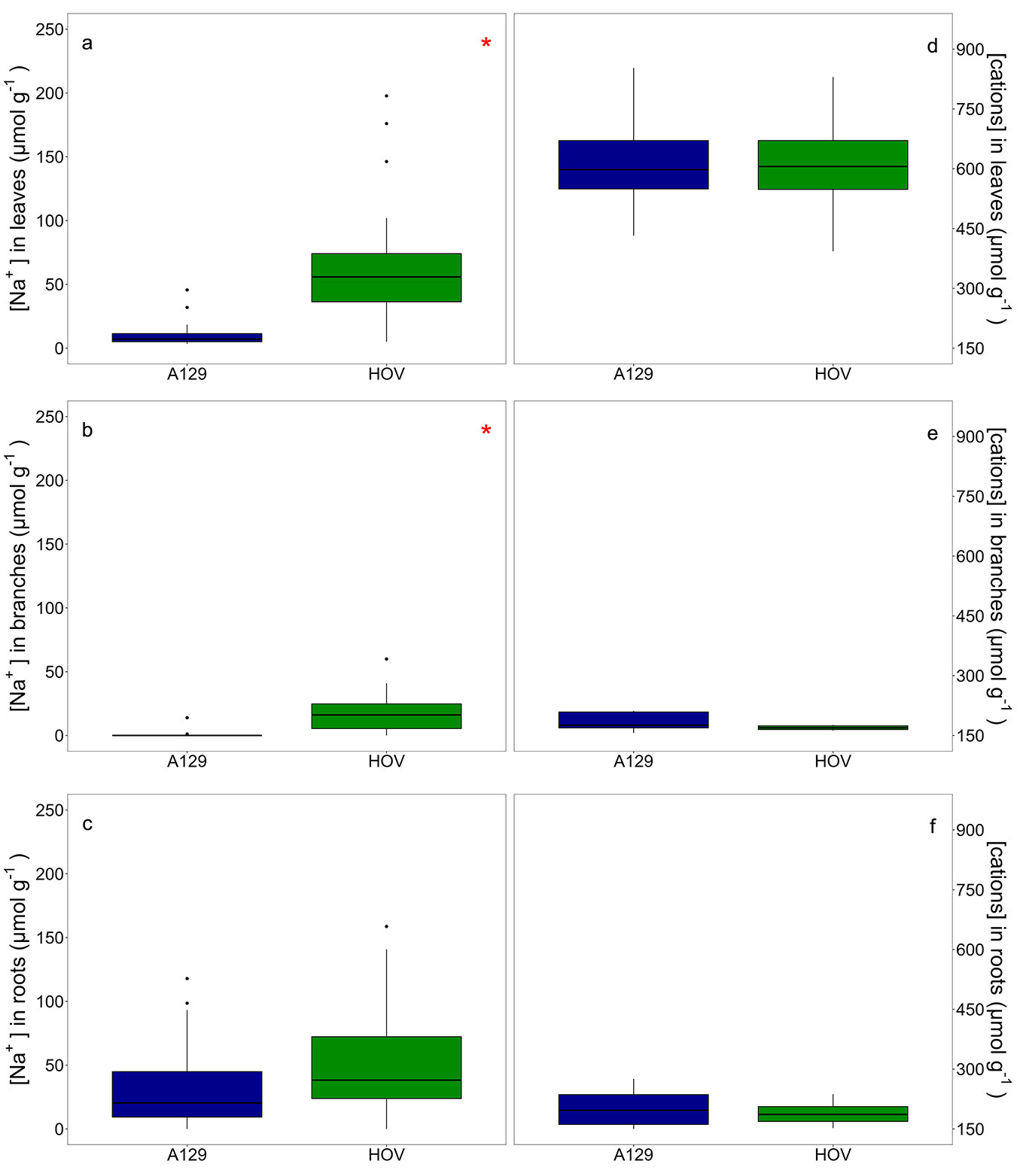 Fig. 2 - Box plots of sodium concentration ([Na+], µmol g-1) in (a) leaves, (b) branches and (c) roots; and box plots of the sum of the cations NH4+, K+, Mg2+, and Ca2+ ([cations], µmol g-1) in (d) leaves, (e) branches and (f) roots. The blue box plots represent P. deltoides ’Australiano 129/60’ (A129), while the green box plots represent P. deltoides ’Hovyú INTA’(HOV). To highlight the concentration differences among compartments for each clone, the same scale is maintained on the y-axis for both [Na+] and [cations]. Compartments with significant differences between clones (p ≤ 0.05) are marked with a red asterisk.
