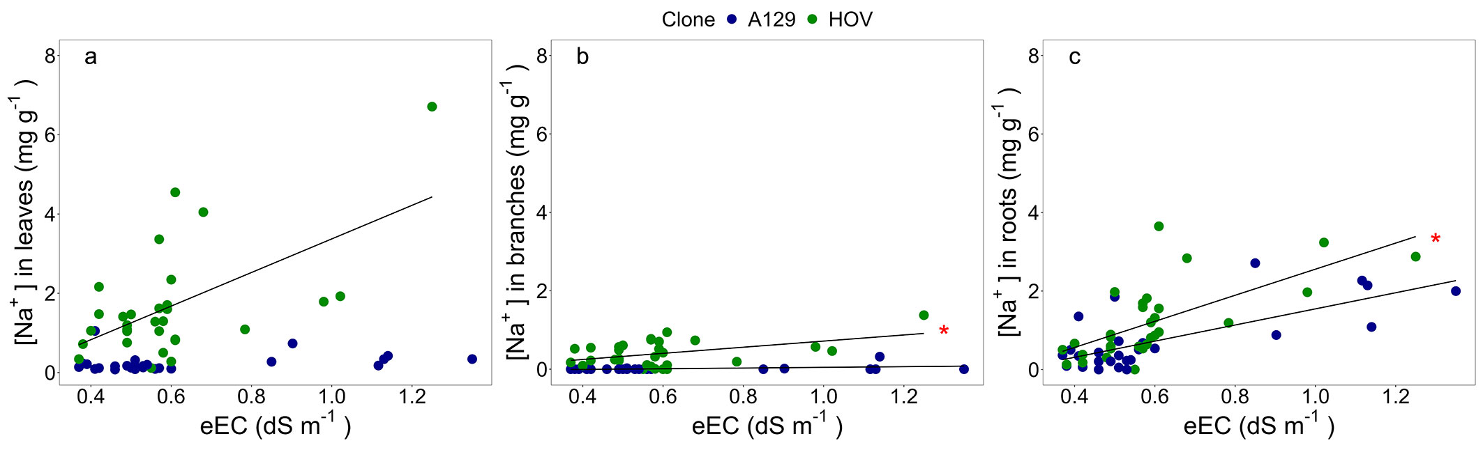 Fig. 3 - Linear regression analyses between the estimated soil electrical conductivity (eEC, dS m-1) and the sodium concentration ([Na+], mg g-1) in (a) leaves, (b) branches, and (c) roots. One linear regression was fitted for each clone and each compartment. In cases where the linear regression was significant (p ≤ 0.05) for both clones, the one with the larger slope was marked with a red asterisk. The linear model, R2, and p-value of each regression are reported in Tab. S2 (Supplementary material).