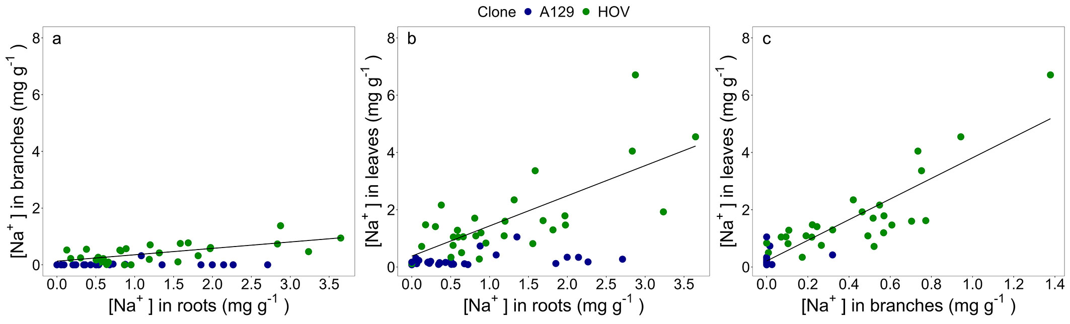 Fig. 4 - Linear regression analyses between (a) sodium concentration ([Na+], mg g-1) in roots and [Na+] in branches; (b) [Na+] in roots and [Na+] in leaves; and (c) [Na+] in branches and [Na+] in leaves. A linear regression was fitted for each clone. Linear model, R2, and p-value of each regression are reported in Tab. S2 (Supplementary material).
