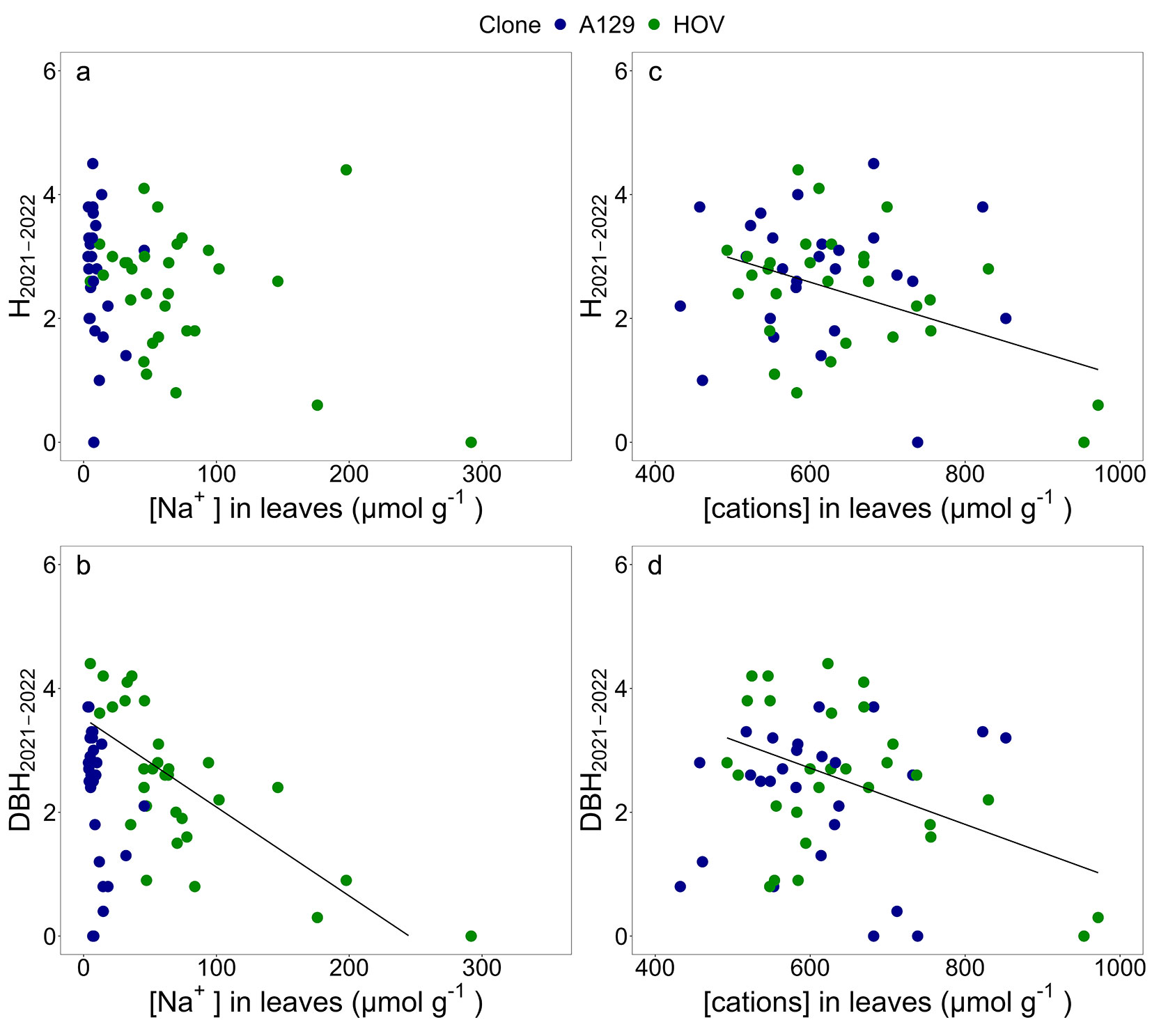 Fig. 5 - Linear regression analyses between (a) sodium concentration ([Na+], µmol g-1) in leaves and height increment (H2021-2022, m); (b) [Na+] in leaves and DBH increments (DBH2021-2022); (c) cations concentration ([cations], µmol g-1) in leaves and H2021-2022; and (d) [cations] in leaves and DBH2021-2022. Height and DBH increments refer to the tree’s growth from the 2021 winter to the 2022 autumn. A linear regression was fitted for each clone. Linear model, R2, and p-value of each regression are reported in Tab. S2 (Supplementary material).
