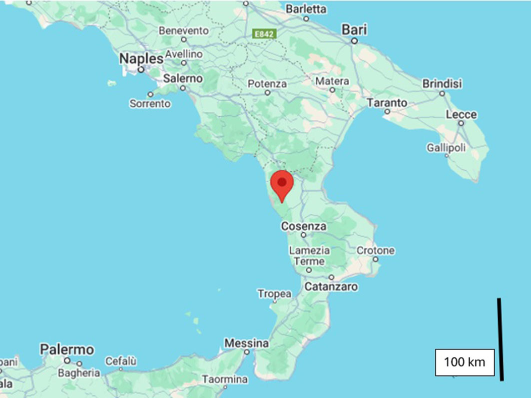 A 2-day trial was conducted on November 19th and 20th, 2024. The trial was conducted in the pilot orchard installed by the National Research Council of Italy (CNR) and the University of Florence at Palummaro (Pidgen Loft, 634 m a.s.l., GPS coordinates 39° 36′ 13.4″ N, 15° 59′ 16.5″ E) in the municipality of Sant’Agata d’Esaro (Cosenza), Southern Italy (Fig. 1). The site is located in the Calabrian coastal range, which offers ideal conditions for chestnut cultivation. For centuries, many villages in the surrounding area thrived on chestnut farming and were reputed producers and exporters of chestnuts ([4]). This legacy is still evident in the many abandoned and semi-abandoned orchards in the landscape, where majestic old trees are surrounded by thick undergrowth consisting of alder, cherry, and oaks.