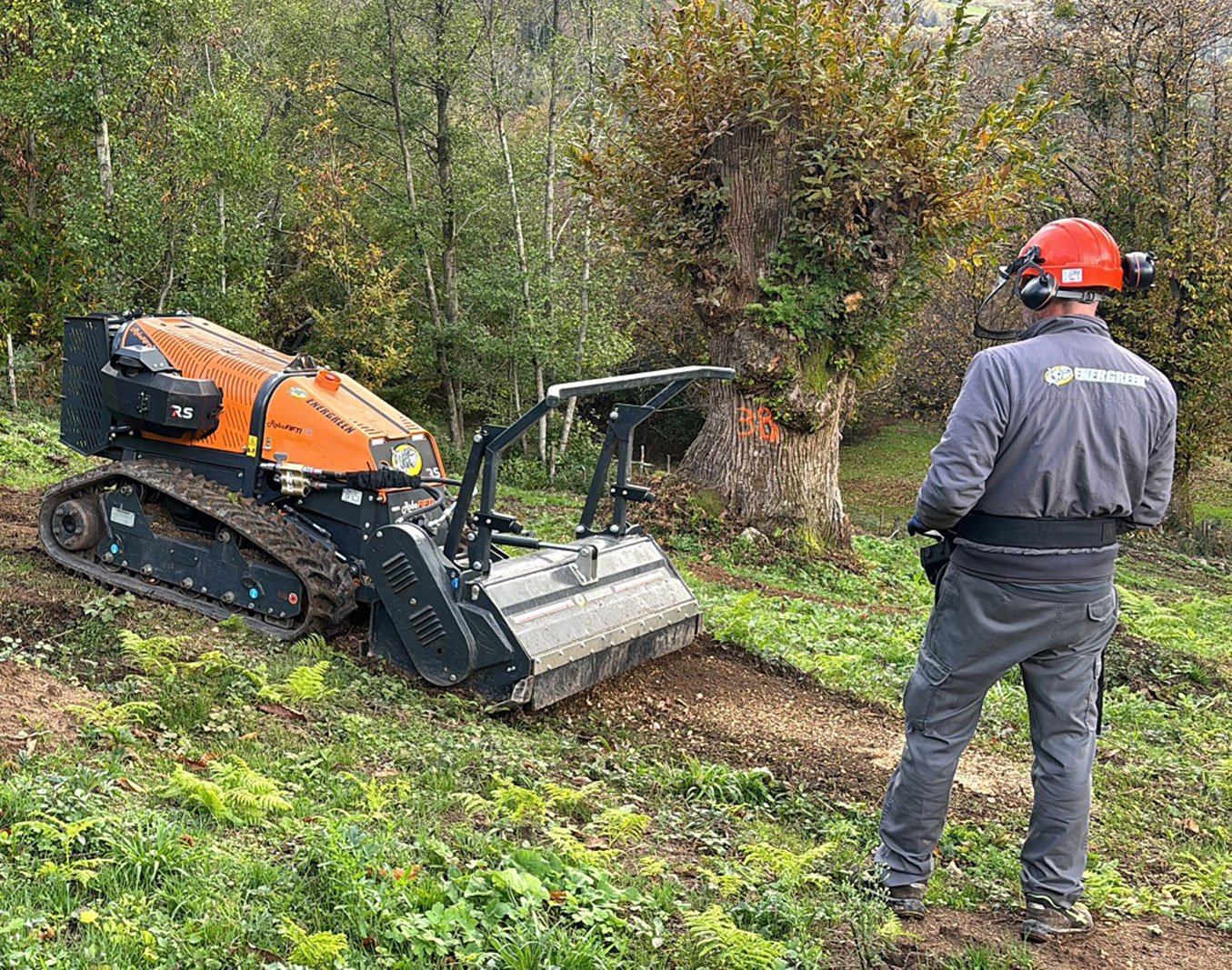 For the test, the machine was equipped with the Energreen 130T forestry mulcher, featuring a rotor with 32 fixed teeth arranged in a helical sequence to ensure an even workload. Each of the 32 interchangeable teeth is coupled with an adjustable cut depth limiter to maintain an even work pace. The 130 T mulcher has a working width of 110 cm and weighs 390 kg, so that the machine used at Pidgeon Loft had a total weight of 1600 kg, which is half the weight of the alternative, i.e., a farm tractor with a conventional forestry mulcher. For all the duration of the test, the machine was operated by Energreen’s own test and demo driver, an experienced professional with all the required formal qualifications (Fig. 2).