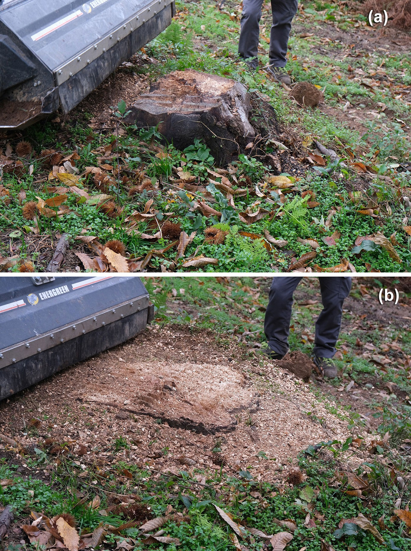 In contrast, the reduction of invasive stumps is a field operation that treats hundreds of stumps per hectare. It must proceed quickly to meet the cost limitations of most agricultural practices. In this case, a heavy forest mulcher might offer a better alternative, and this was the equipment considered for this study. In turn, the type of mulcher selected for chestnut orchards had to be light enough to be moved on a light transport, given that most Italian chestnut farms are small ([10]) and the operation might require frequent relocation. A further benefit of adopting a light, agile machine is reducing soil compaction, which increases sensitivity to root disease ([14]).