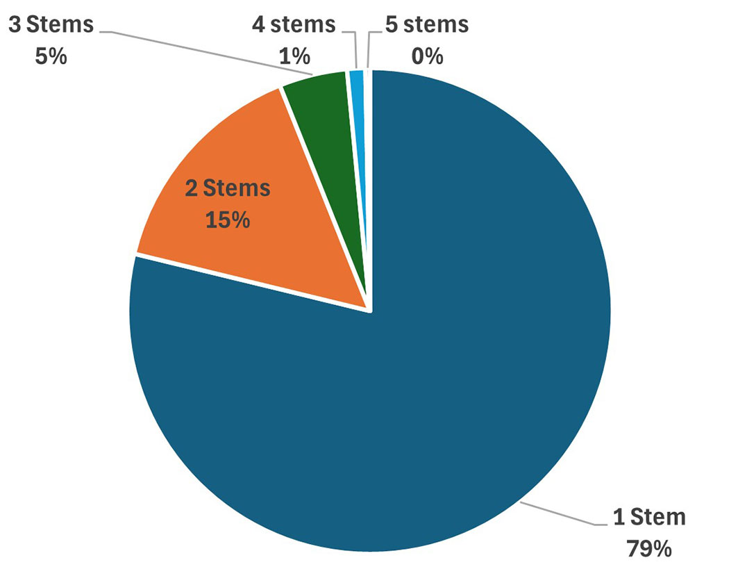 The majority (79%) of the cut stumps showed evidence of carrying a single stem, indicating that the invasive alder was in its pristine condition at the time of removal and had not been coppiced previously (Fig. 4, Tab. 2). The few instances of multiple stems might result from browsing damage or occasional opportunistic cuts made by the previous tenants and/or passing shepherds. Mean stump height was reasonably close to the ground and matched the prescribed good cutting practice. Cutting much closer to the ground could dramatically increase saw-tooth wear and incur an excessive risk of saw damage. Stump size was consistent with that of alder trees aged 15-20 years. The few huge stumps were, in fact, multi-stem clumps that were cut below the insertion of the stems. A moderate diameter and low cutting height resulted in a relatively small volume of wood to be ground, with the majority of stumps falling within the 12-liter volume limit (upper quartile). The preliminary inspection detected only very few cases of severe decay, and those stumps were excluded from the study. They were not numbered and the researchers smashed them to ground level with their boots. Observation during the test confirmed the absence of severely decayed stumps, which would otherwise have been detected by a different sound (hammers hitting soft rather than solid wood) and by the shape and size of the wood chips. This would not exclude various subtler degrees of “softening” that occurred during the 22 months the stumps were left on the ground after cutting.