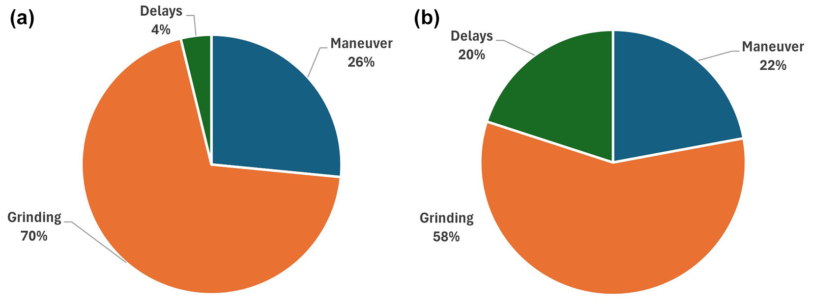 Fig. 5 - Distribution of worksite time by activity type. Distribution actually measured during the study (a) and simulated for a more realistic incidence of delays estimated at 20% of the total (b).