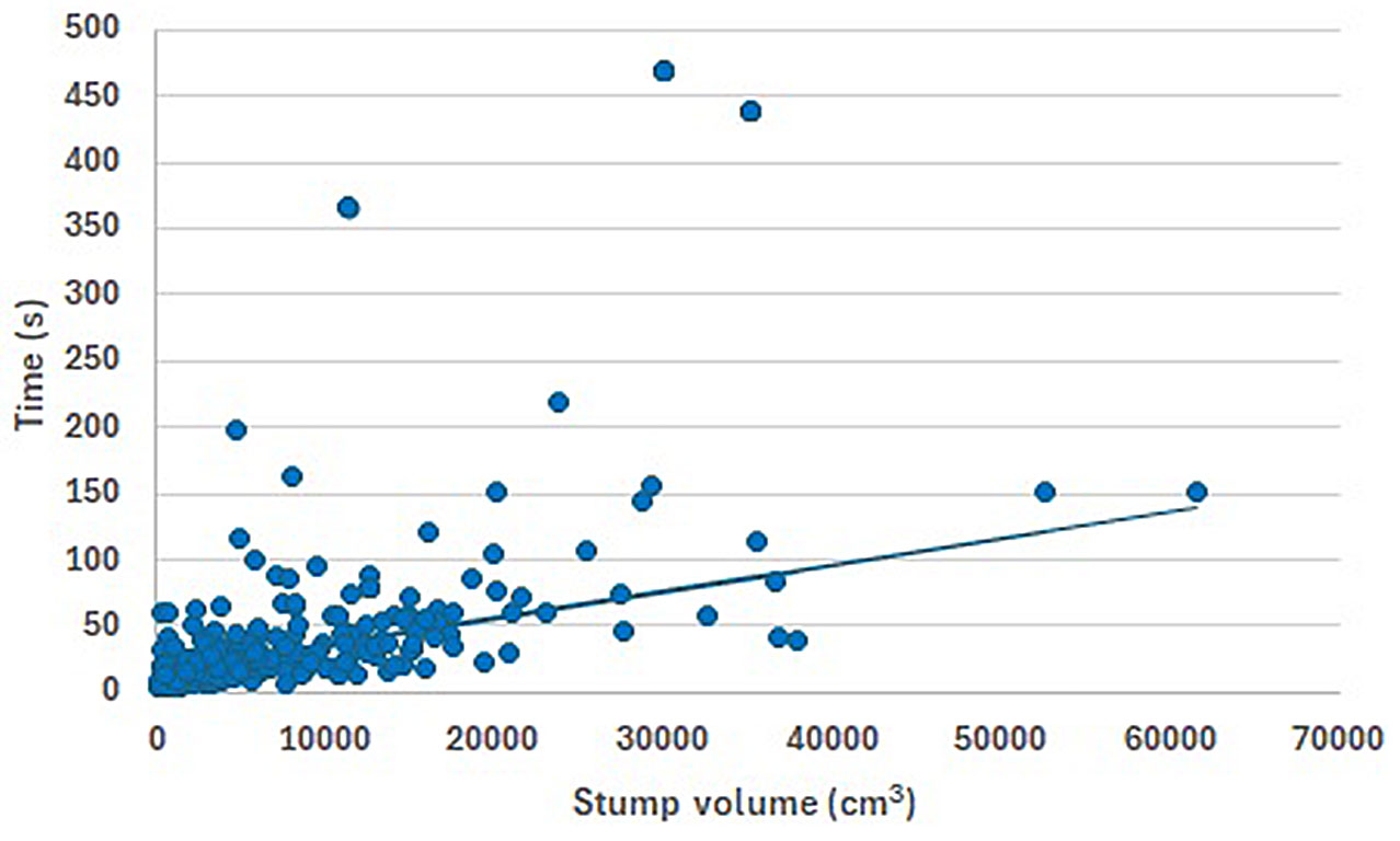 Data analysis consisted of extracting simple descriptive statistics to provide solid indicators of centrality and variability. Then, regression analysis was used to check the statistical significance of the relationships between time consumption and stump characteristics (diameter, height, etc.). The effect of species difference was tested by introducing an indicator variable for hard stumps (exclusively chestnut). The chosen significance level was α = 0.05.