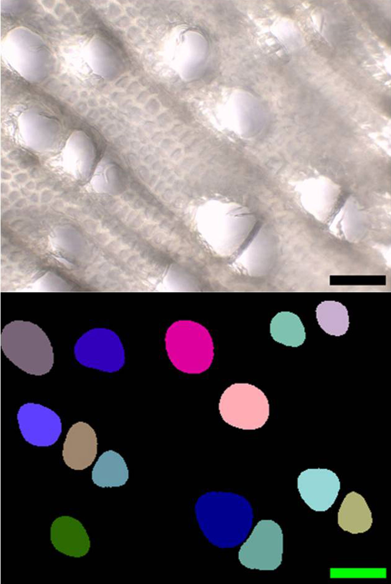 Fig. 1 - Light micrograph of the stem cross-section of a one-year-old shoot of the poplar clone Bora in the zone of secondary xylem (top panel) and the corresponding label image of vessels (bottom panel). Scale bar: 50 µm.