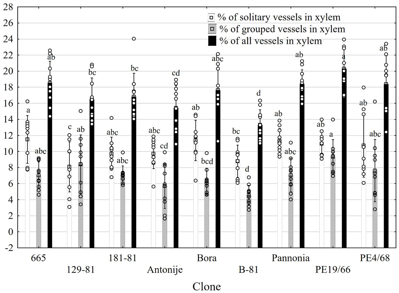 Vessels in the examined clones were present either as solitary or in groups. The highest total proportion of vessels in xylem (20.3%) was observed in clone PE19-66, followed by clones PE4-68, 665, Pannonia, and Bora (Fig. 4). In contrast, the lowest proportion of vessels was recorded in clone B-81 (13.3%). With the exception of clone 129-81, solitary vessels were significantly more numerous relative to grouped ones in all clones.