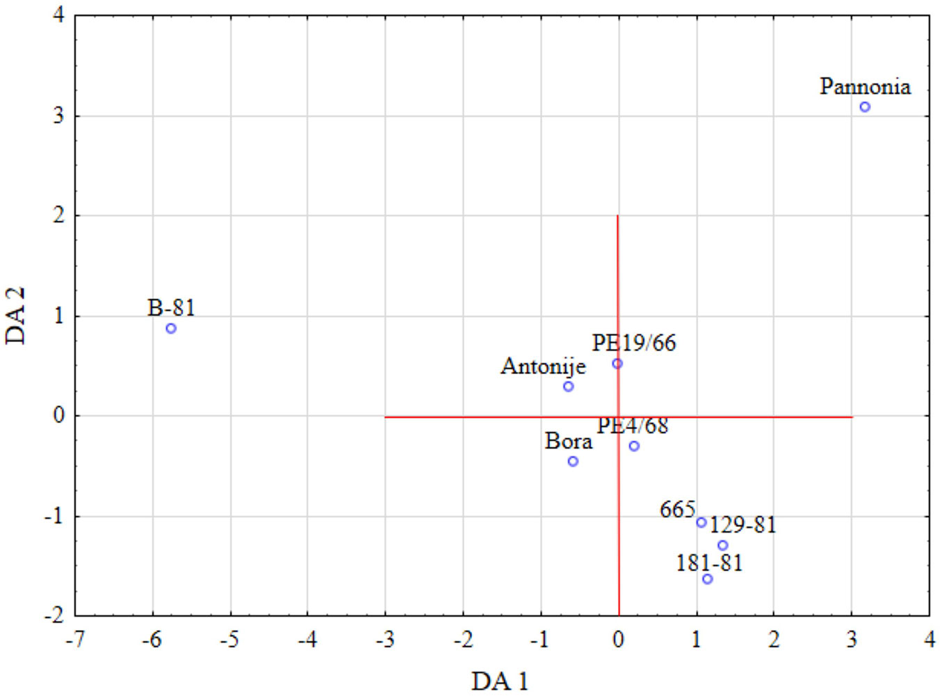 Discriminant analysis along the first two axes distinctly separated two clones, B-81 and Pannonia, which exhibited extreme values in quantitative xylem characteristics, compared to the other examined clones. However, all clones exhibited similar variability in xylem parameters, making further separation by PCA statistically insignificant.