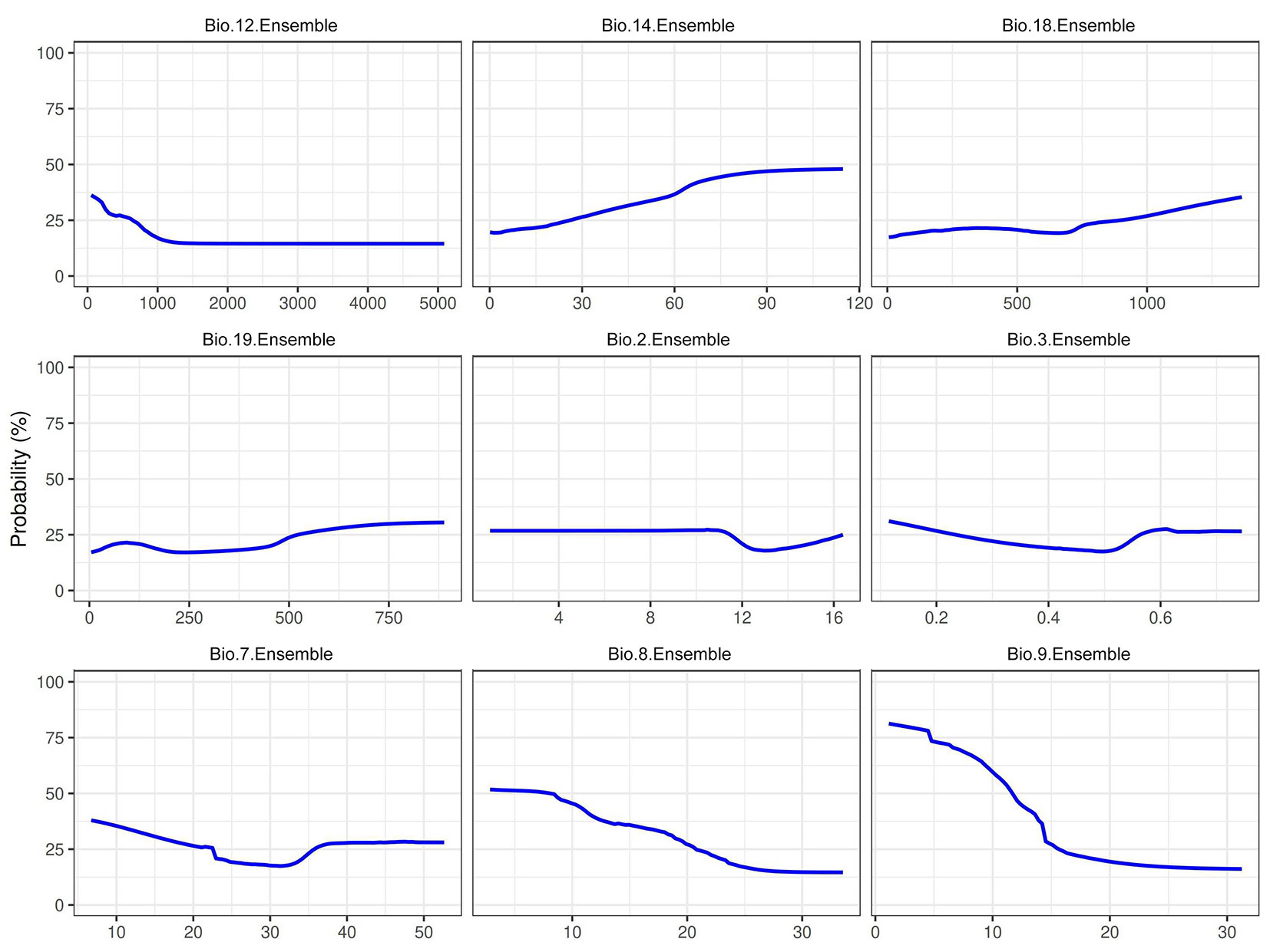 Fig. 1 - Response curve of the EMwmean for Bio 12 (annual precipitation), Bio 14 (precipitation of driest month), Bio 18 (precipitation of warmest quarter), Bio 19 (precipitation of coldest quarter), Bio 2 (mean diurnal range), Bio 3 (isothermality), Bio 7 (temperature annual range), Bio 8 (mean temperature of wettest quarter) and Bio 9 (mean temperature of driest quarter).