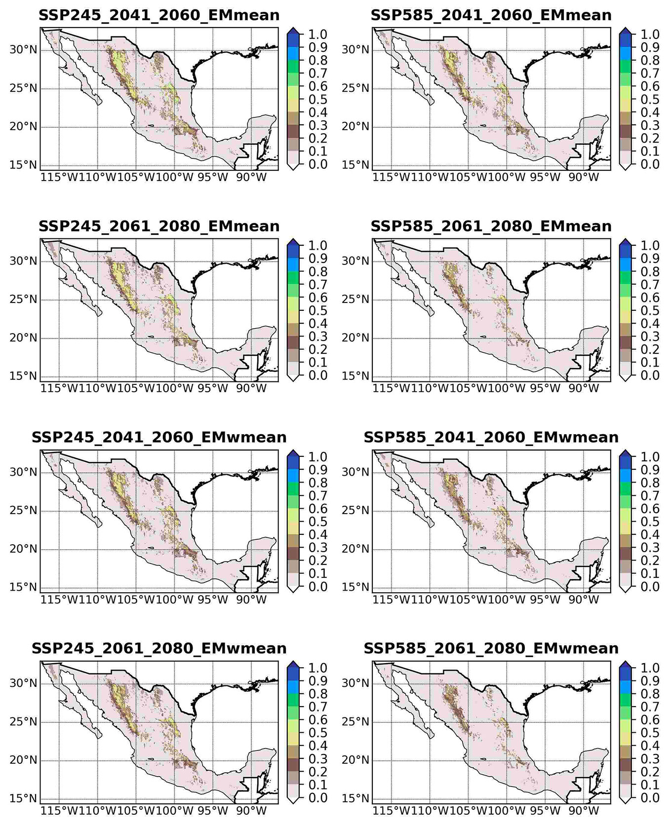 Range-change statistics (Tab. 4) reveal severe losses under all scenarios. For 2041-2060, EMmean projects a 65.6% decline under SSP245 and 74.1% under SSP585; EMwmean estimates losses of 67.8% and 76.7%, respectively. The most extreme contractions occur during 2061-2080 under SSP585, with projected losses of 84.6% (EMmean) and 85.9% (EMwmean). No scenario predicts net habitat gain. These changes are particularly pronounced in northern Mexico, along both the Sierra Madre Oriental and Sierra Madre Occidental, where the current range is projected to decline significantly.