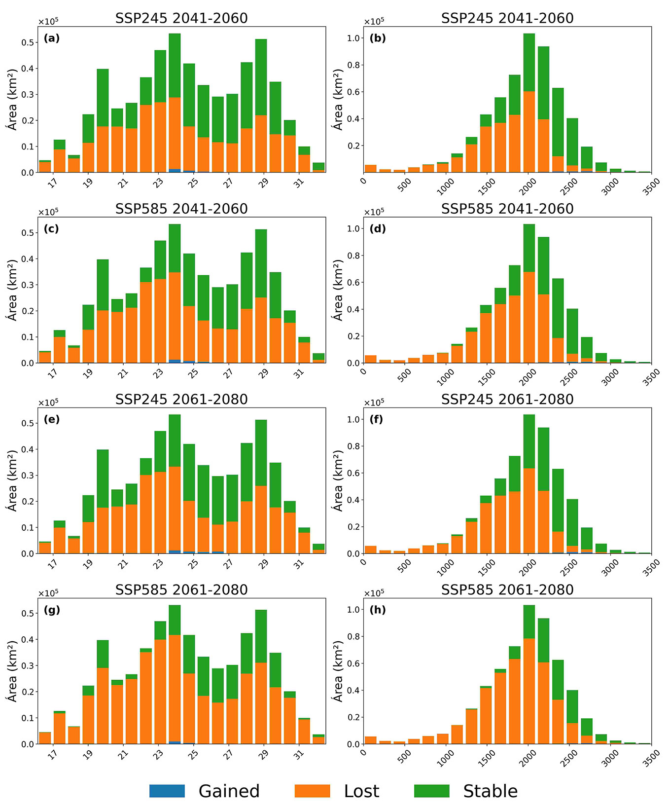 Fig. 4 shows that the stable category is most extensive between 22° and 26 °N and at elevations of 1500-2500 m a.s.l. Habitat gains remain marginal, accounting for less than 5% of the landscape, and are restricted to latitudes below 20° N and mid-elevations (1000-1500 m). Under SSP245 (2041-2060), approximately 25% of stable habitat is lost, whereas under SSP585 (2061-2080) losses exceed 50%, reflecting a pronounced contraction of the species’ current range.
