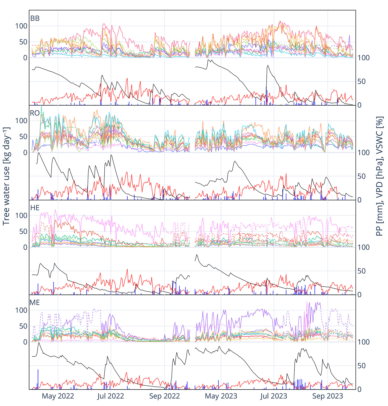 Fig. 1 - Daily tree water use (TWU, left y-axis, measured: solid lines, modeled: dashed lines) and corresponding daily mean relative extractable water (REW, black line), maximum air vapor pressure deficit (VPD, red line), and rainfall (PP, blue line) at Bad Belzig (BB), Rottenburg (RO), Heinersreuth (HE), and Merzalben (ME) for 2022 and 2023. Note the partly synchronous course between TWU and REW or VPD.
