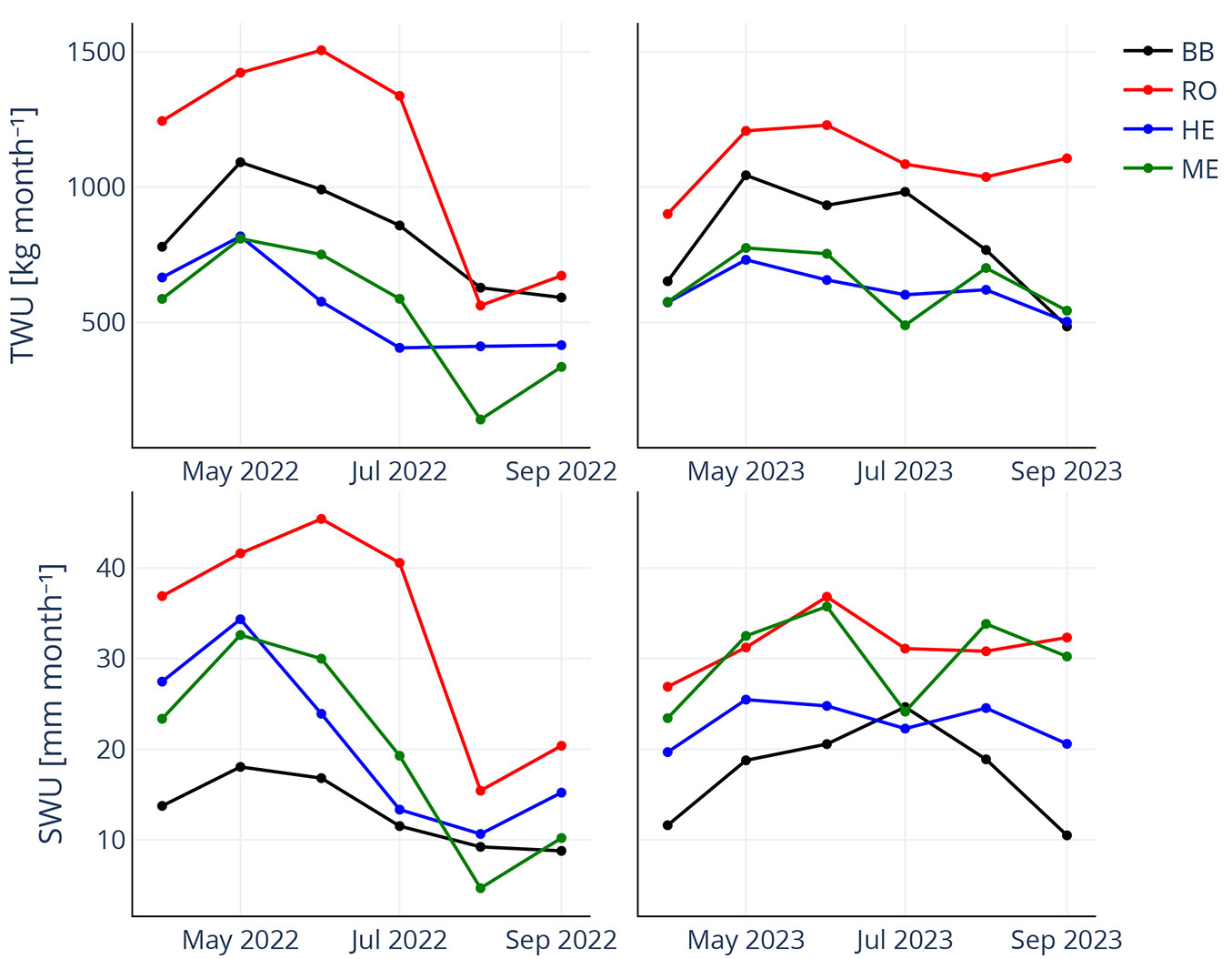 The mean daily and total annual TWU and SWU were generally higher during the relatively wetter year of 2023, except at RO (Tab. 3), where TWU and SWU were much higher than at the other sites. The lowest TWU was measured at HE and ME during 2022, but the lowest SWU was estimated for BB.