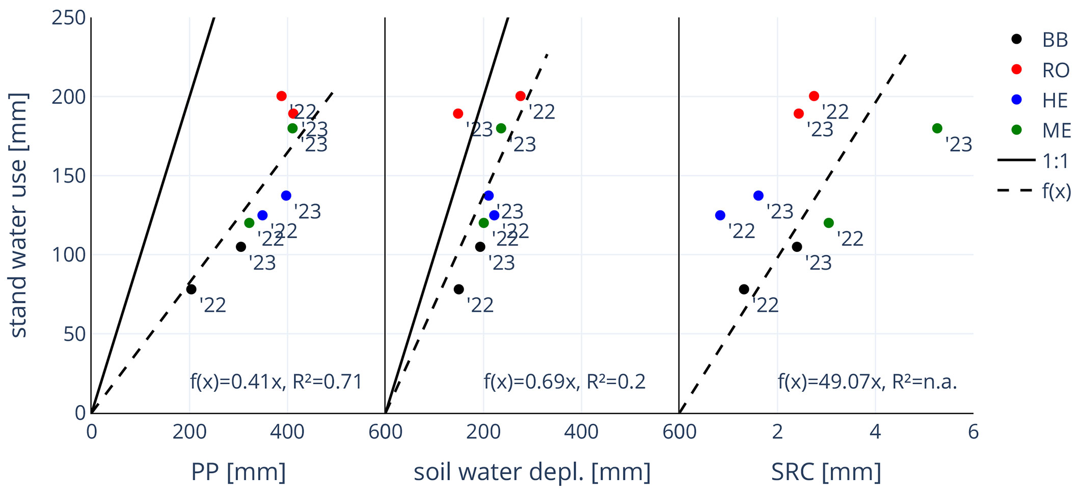 Fig. 3 - Growing season (Apr 1 - Sep 30) stand water use (SWU) in relation to the corresponding sum of rainfall (PP), soil water depletion in the upper 40 cm, and mean stem radial change (SRC) at all four sites. Data points for 2022 (’22) and 2023 (’23) are labeled individually. A 1:1 relation is illustrated with a solid black line and linear regression with a dashed black line. The corresponding functions are given below in each panel. R2 for the linear regression between SRC and SWU could not be calculated, but slopes between the two data points within each site are very similar (BB: 25.8, RO: 35.6, HE: 15.9, ME: 27.0 mm SWU per mm SRC).