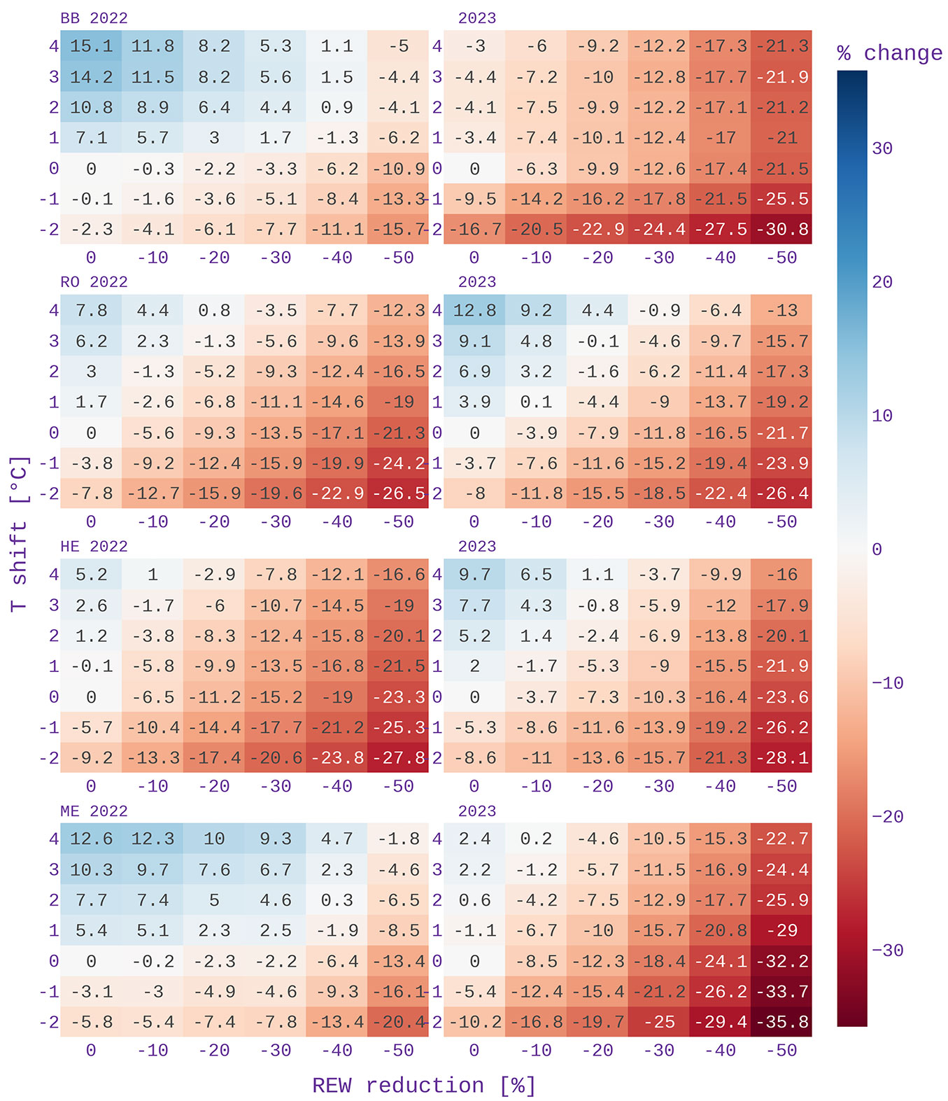 A random forest model for each site was trained to simulate SWU, using the daily maximum VPD and mean REW as predictors. Analog to the random forest models for TWU, model parameters were tuned manually, and the minimum samples per leaf was set to 1 and the minimum samples per split to 2. All other parameters were set equal to the models for single trees. SWU was simulated for the growing seasons of 2022 and 2023 under shifted mean daily temperatures and REW. The average temperature for both years was already 0.7-1.8 °C above the temperature average for 1961-1990 (Tab. 2) and was therefore possibly exceptionally warm. We therefore tested temperature shifts of -2 to +4 °C in 1 °C increments. VPDmax was calculated according to Goff & Gratch ([16]) using the shifted daily maximum temperature. The daily minimum relative humidity was adjusted by -Tshift · 1.5 to account for the change in relative humidity expected by the IPCC report for the years 2081-2100 (Fig. 4.23 in [21]). For REW, we tested a reduction of up to 50% in steps of 10%. The accuracy (%) of the model was calculated with the following formula (eqn. 3):