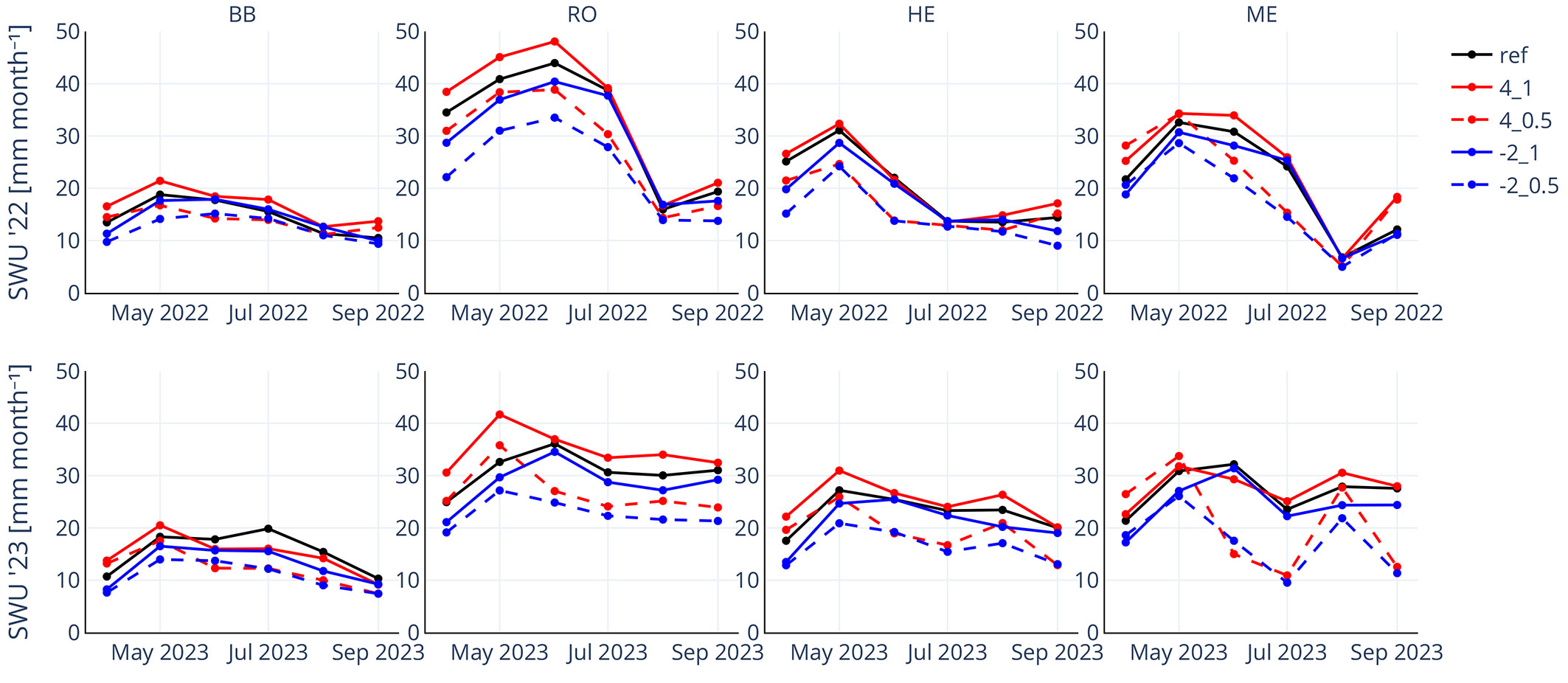 Growing season SWU is linearly related to rainfall and soil water depletion during the same period, both within each site but also across all four sites (Fig. 3). SWU accounts for between 34% and 51% of growing season rainfall and 52% to 127% of soil water depletion within the upper 40 cm of soil (Tab. 4). The ratios between SWU and PP in 2022 and 2023 are very similar for each site with no clear tendency, but the ratios between SWU and soil water depletion were consistently higher in 2023. This means that during a dry year like 2022, more water has to be withdrawn from deeper soil depths.