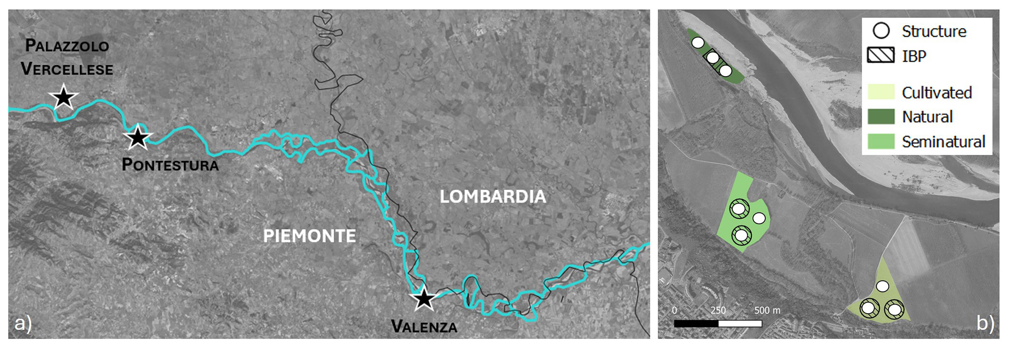 We selected three sites (Palazzolo Vercellese, Pontestura, Valenza) along the Po River in the Piedmont region, Northern Italy (Fig. 1a) included in the restoration actions areas (PNRR M2C4 investment 3.3) of the Parco Naturale del Po Piemontese. The landscape is highly simplified, characterized by high-intensity rural cropping and varying degrees of urban sprawl ([37]). The restoration actions include new forest plantations to improve biodiversity and ecosystem services. For each site, three types of poplar woodlands were sampled (Fig. 1b, Tab. 1): a natural stand (i.e., derived from spontaneous recovery of vegetation), a semi-natural stand (i.e., planted for biodiversity restoration purposes and under spontaneous evolution for years), and an intensively managed one as a control stand (i.e., the most simplified stand structure of cultivated poplars). Within each stand, data were collected in three replicated 314 m2 circular plots (minimum distance among plots of 20 m), for a total of 27 plots. Plots were randomly selected within each stand in a homogeneous area, aiming to include the largest variability in stand structure, harrowing, and species composition. For IBP calculation, one or two 1-ha reference plots were selected based on the overall stand area. Their shape (circular, quadrangular, or rectangular) varied according to the stand features and the related core area extension. At least one of the three structural plots falls within the IBP plot.